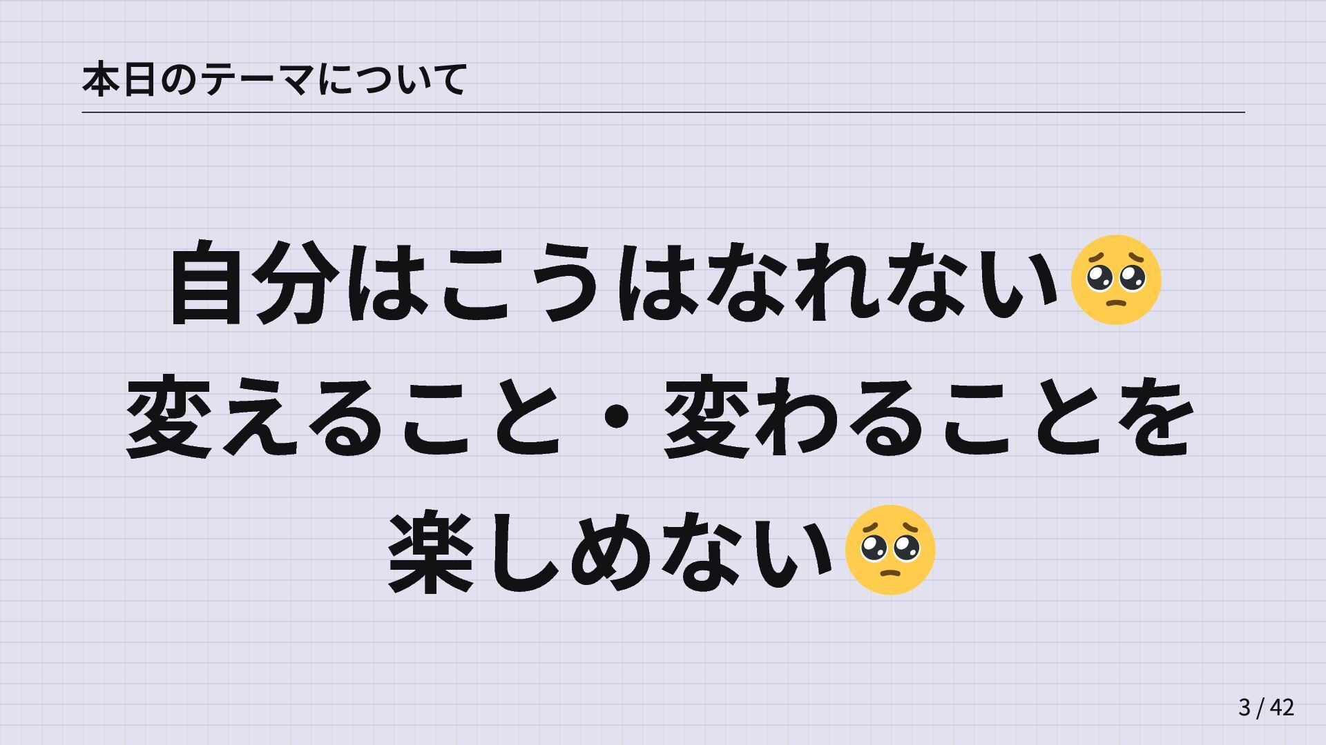 本日のテーマについて 自分はこうはなれない 変えること・変わることを 楽しめない 3 / 42