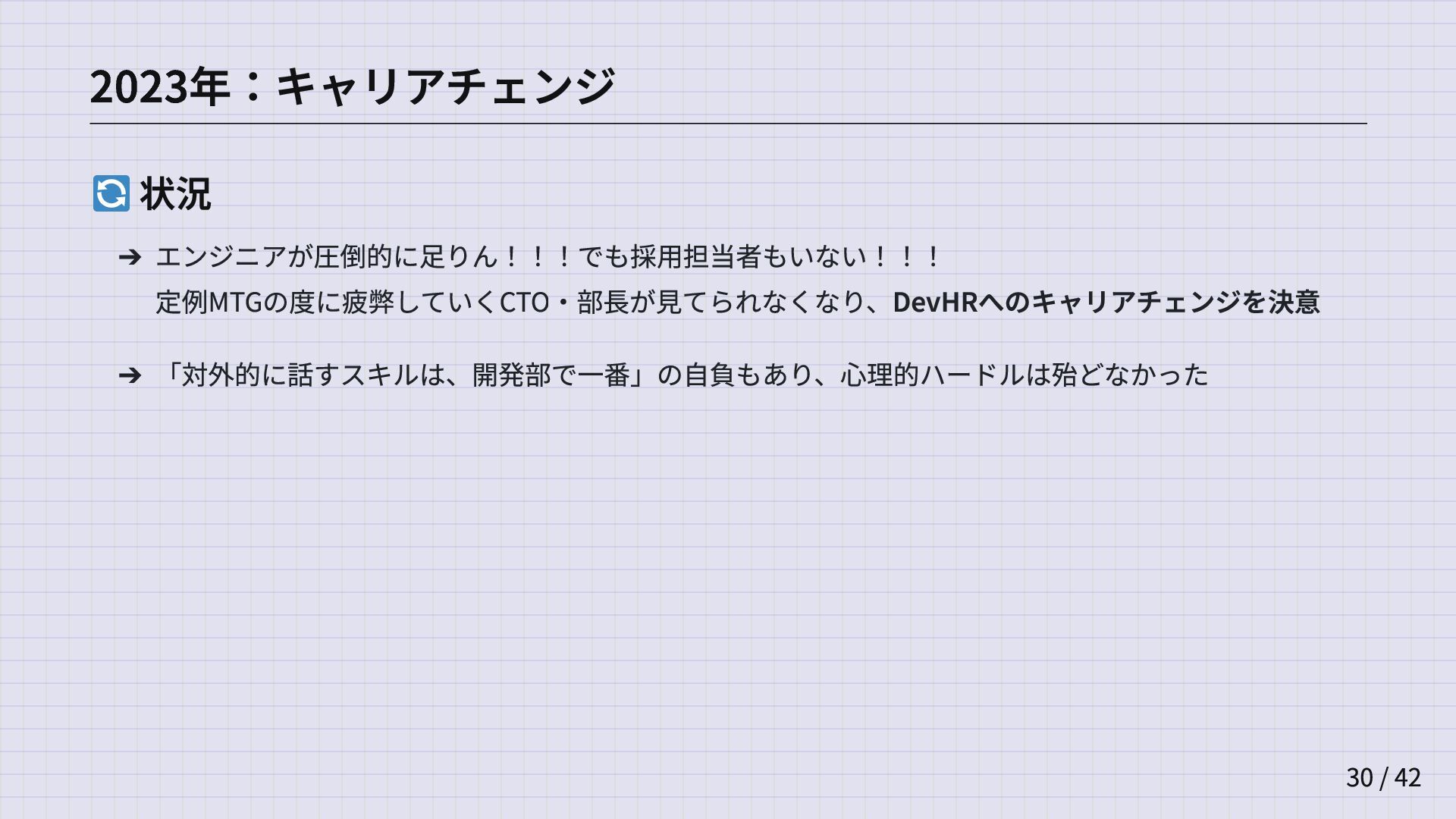 2023年:キャリアチェンジ 状況 ➔ エンジニアが圧倒的に足りん!!!でも採用担当者もいない!!! 定例MTGの度に疲弊していくCTO・部長が見てられなくなり、DevHRへのキャリアチェンジを決意 ➔ 「対外的に話すスキルは、開発部で一番」の自負もあり、心理的ハードルは殆どなかった 30 / 42