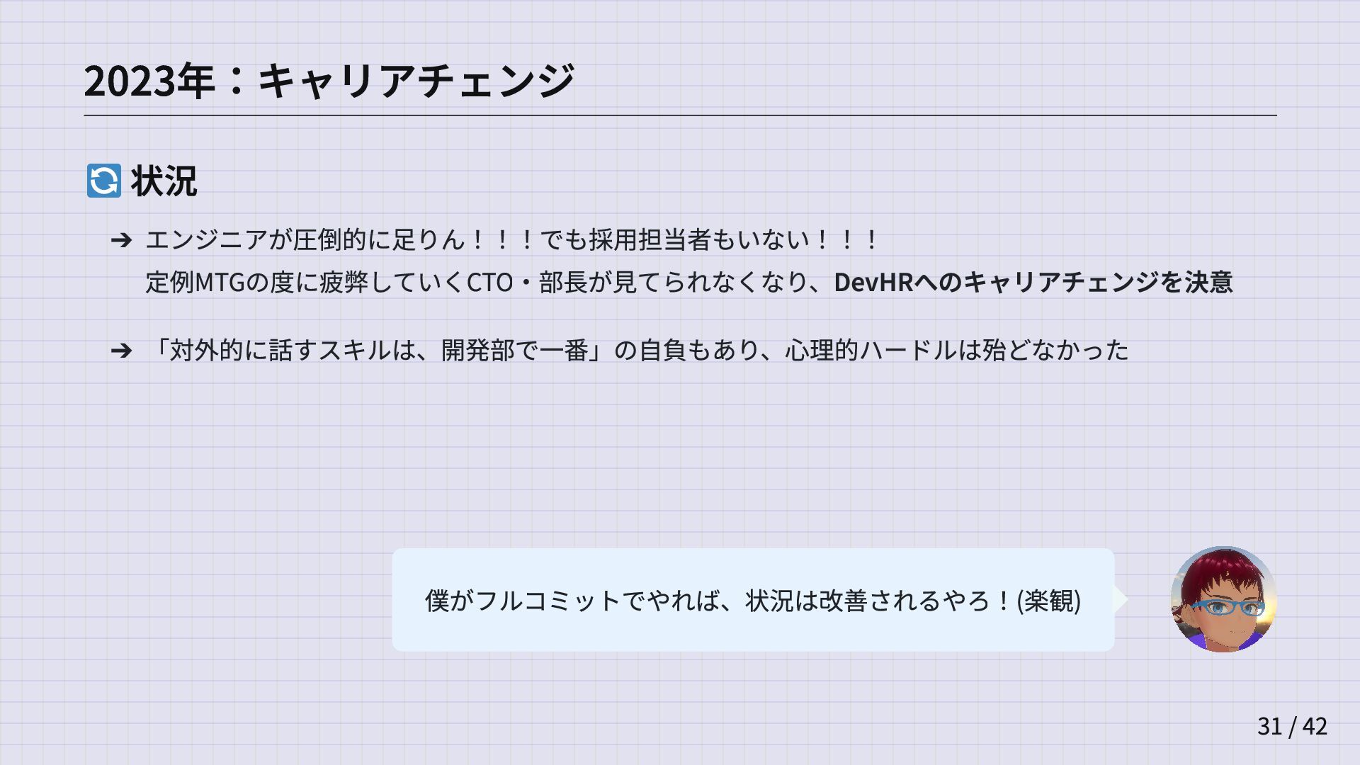 2023年:キャリアチェンジ 状況 ➔ エンジニアが圧倒的に足りん!!!でも採用担当者もいない!!! 定例MTGの度に疲弊していくCTO・部長が見てられなくなり、DevHRへのキャリアチェンジを決意 ➔ 「対外的に話すスキルは、開発部で一番」の自負もあり、心理的ハードルは殆どなかった 31 / 42