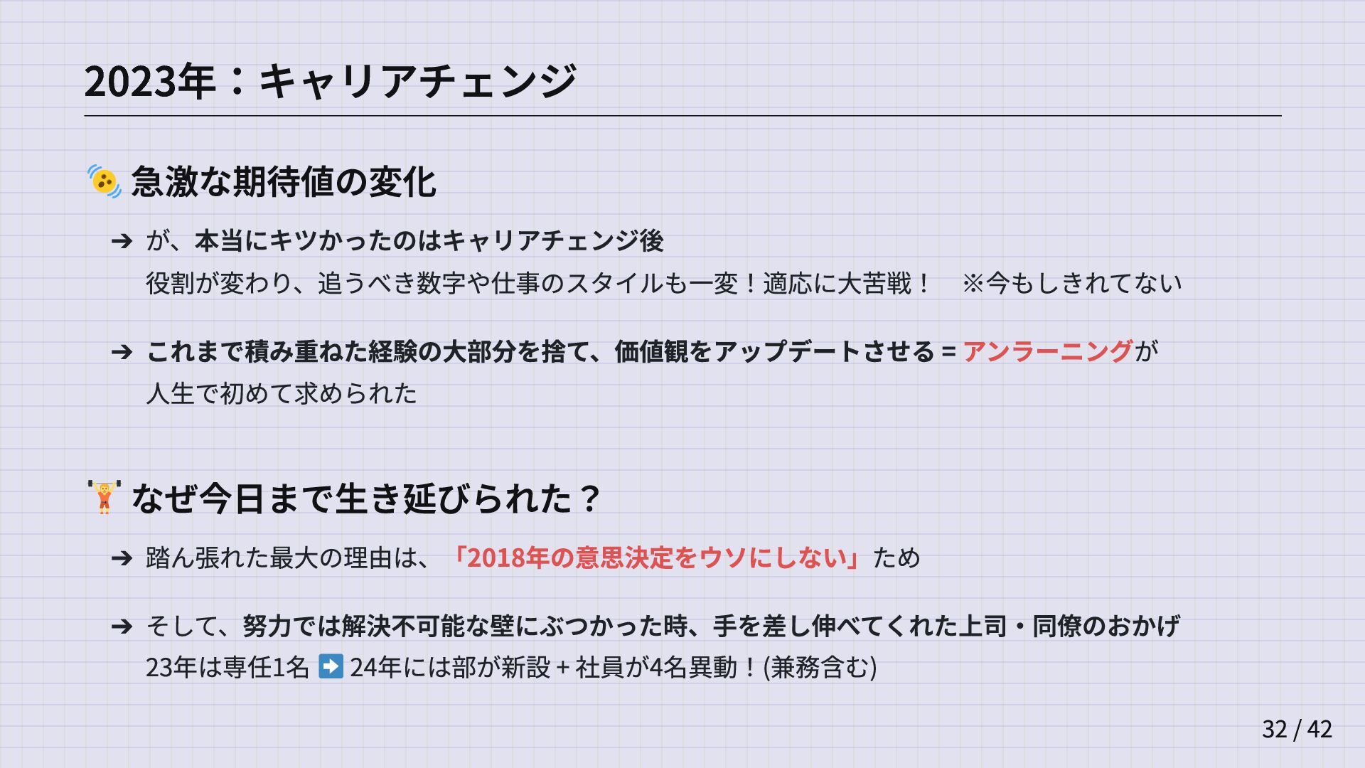 2023年:キャリアチェンジ 急激な期待値の変化 ➔ が、本当にキツかったのはキャリアチェンジ後 役割が変わり、追うべき数字や仕事のスタイルも一変!適応に大苦戦! ※今もしきれてない ➔ これまで積み重ねた経験の大部分を捨て、価値観をアップデートさせる = アンラーニングが 人生で初めて求められた