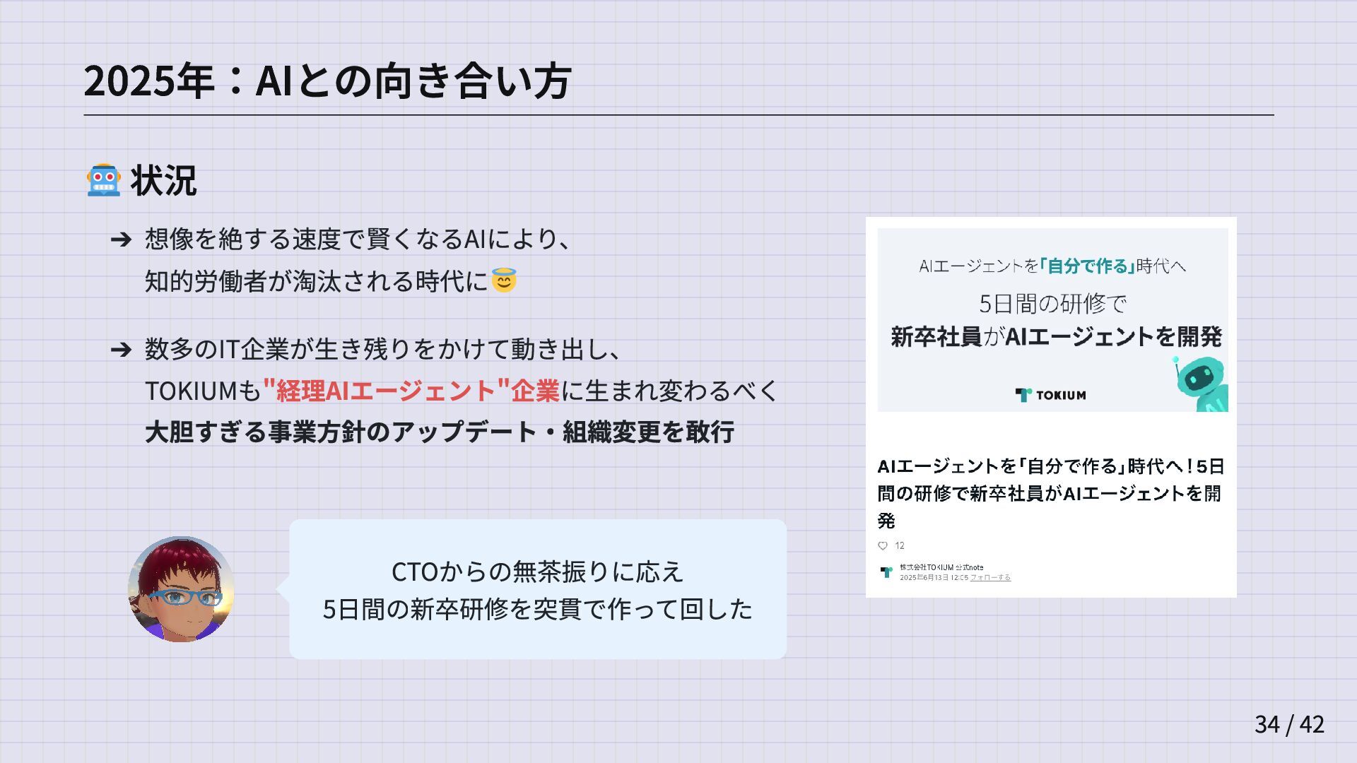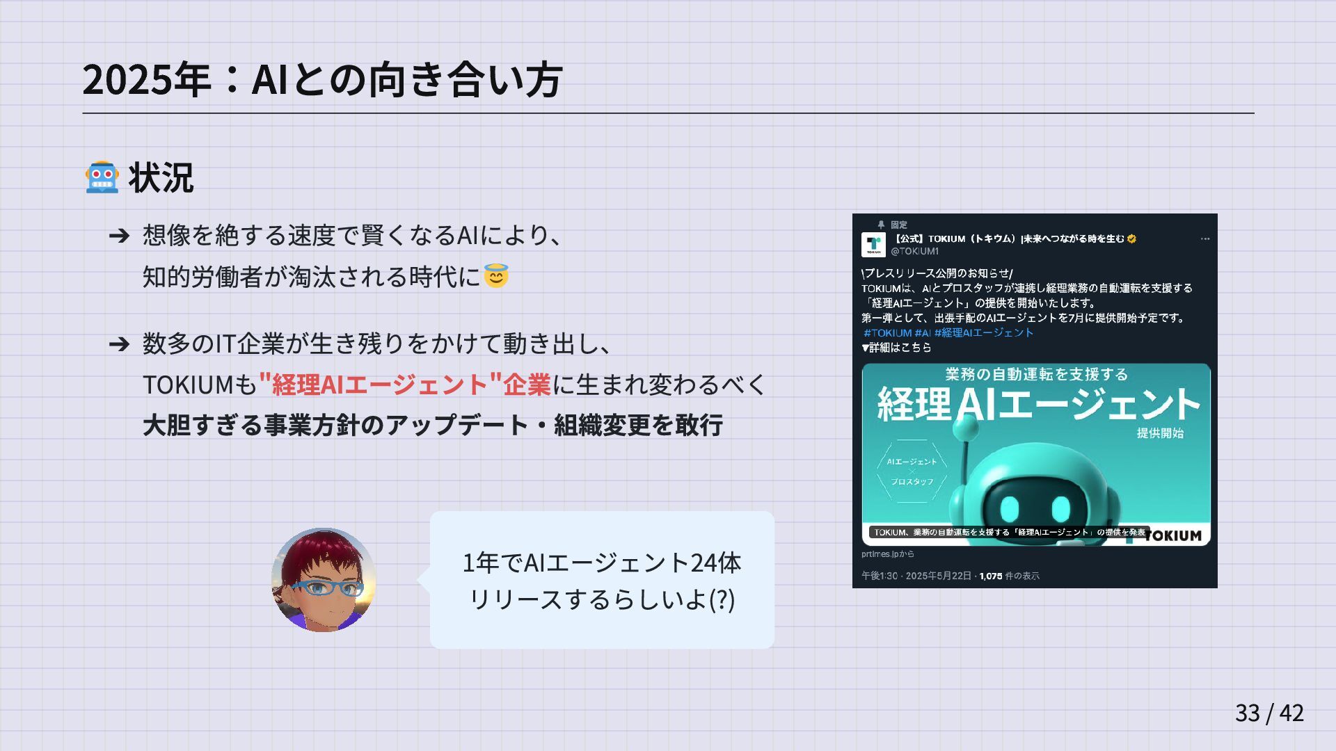 2025年:AIとの向き合い方 状況 ➔ 想像を絶する速度で賢くなるAIにより、 知的労働者が淘汰される時代に ➔ 数多のIT企業が生き残りをかけて動き出し、 TOKIUMも"経理AIエージェント"企業に生まれ変わるべく 大胆すぎる事業方針のアップデート・組織変更を敢行 33