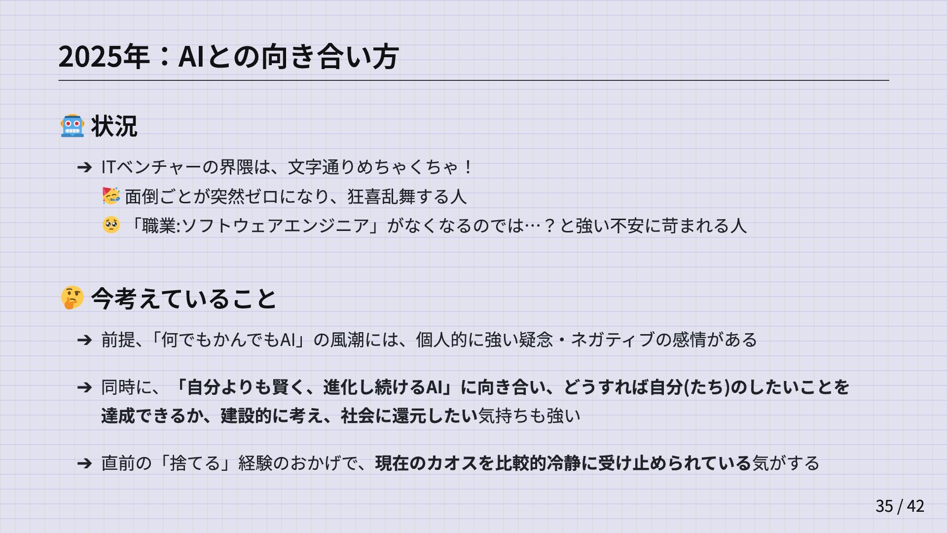 ➔ 同時に、「自分よりも賢く、進化し続けるAI」に向き合い、どうすれば自分(たち)のしたいことを 達成できるか、建設的に考え、社会に還元したい気持ちも強い ➔ 直前の「捨てる」経験のおかげで、現在のカオスを比較的冷静に受け止められている気がする 35 / 42