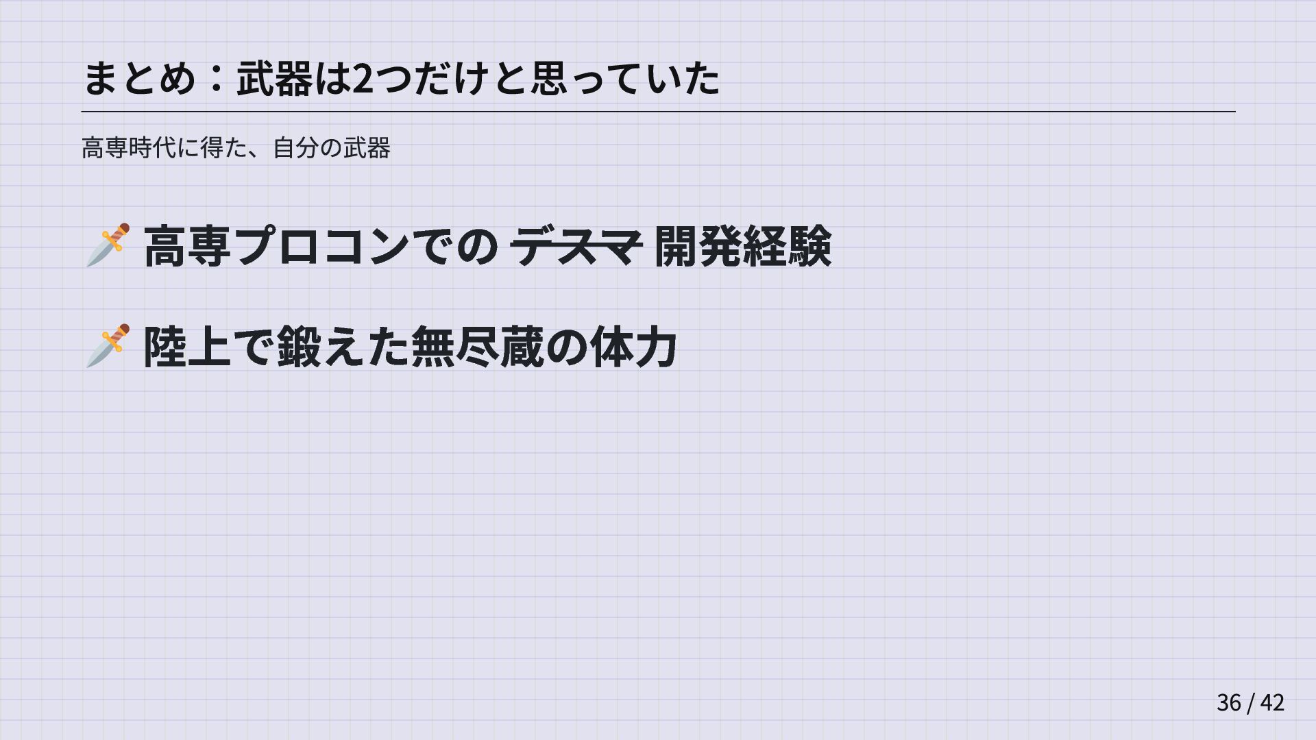 まとめ:武器は2つだけと思っていた 高専時代に得た、自分の武器 高専プロコンでの デスマ 開発経験 陸上で鍛えた無尽蔵の体力 36 / 42