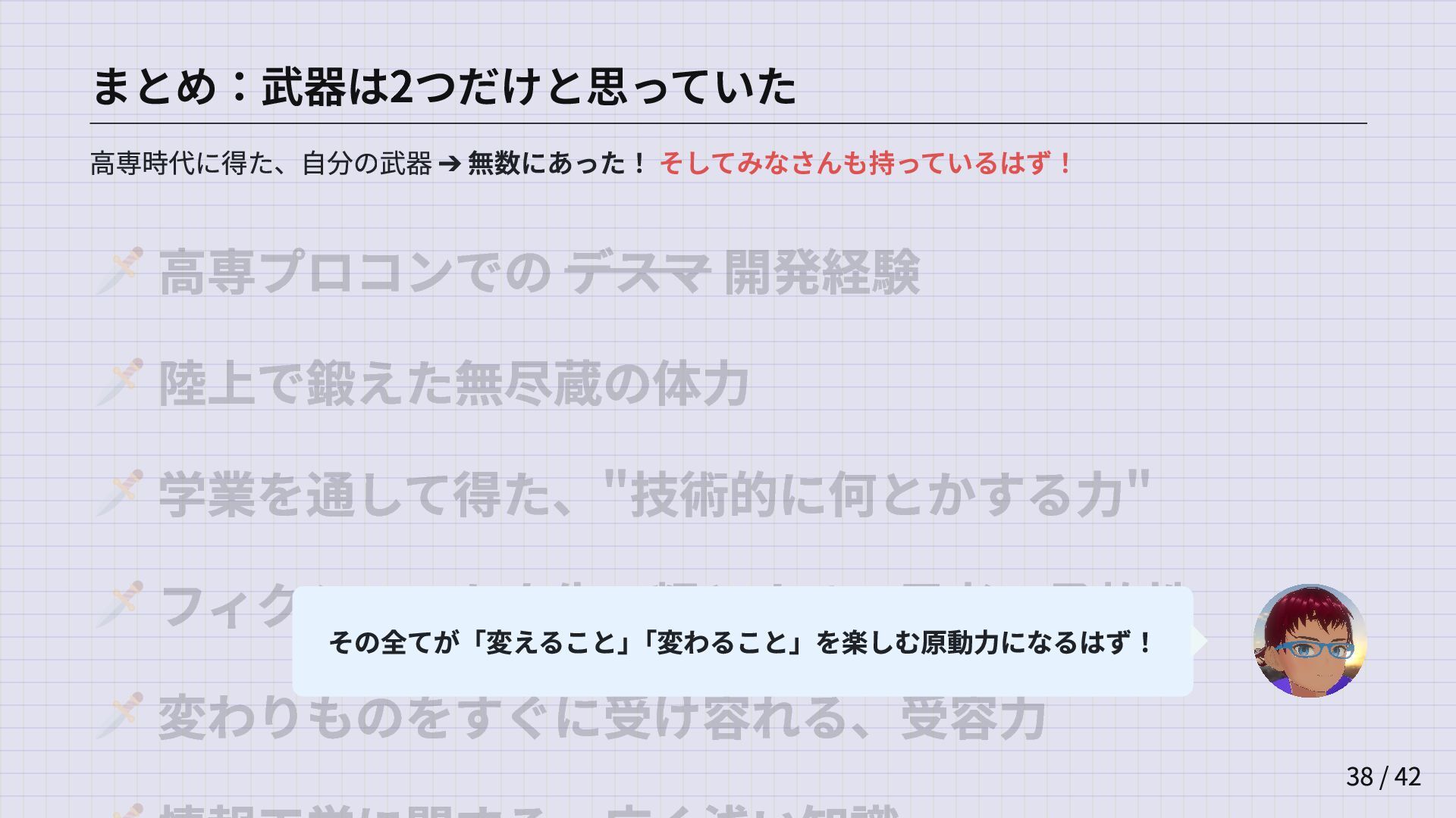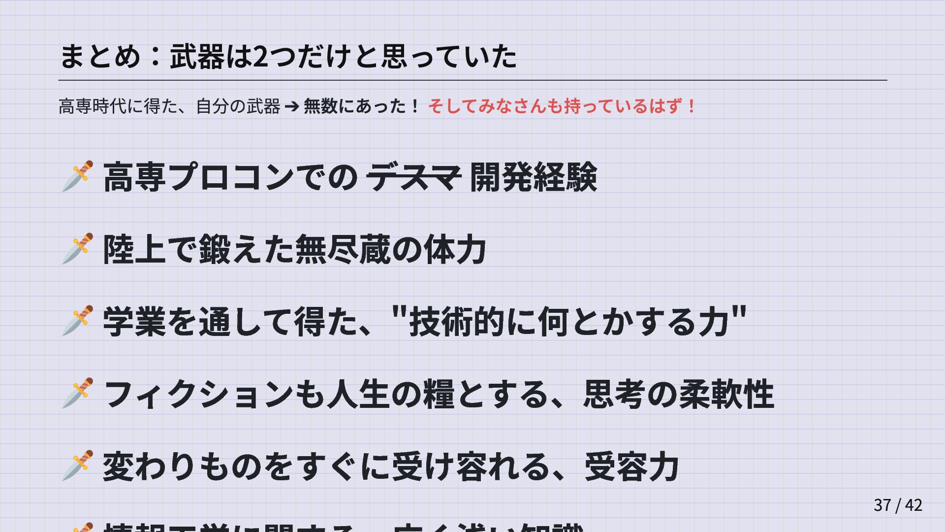 まとめ:武器は2つだけと思っていた 高専時代に得た、自分の武器 ➔ 無数にあった! そしてみなさんも持っているはず! 高専プロコンでの デスマ 開発経験 陸上で鍛えた無尽蔵の体力 学業を通して得た、"技術的に何とかする力"
