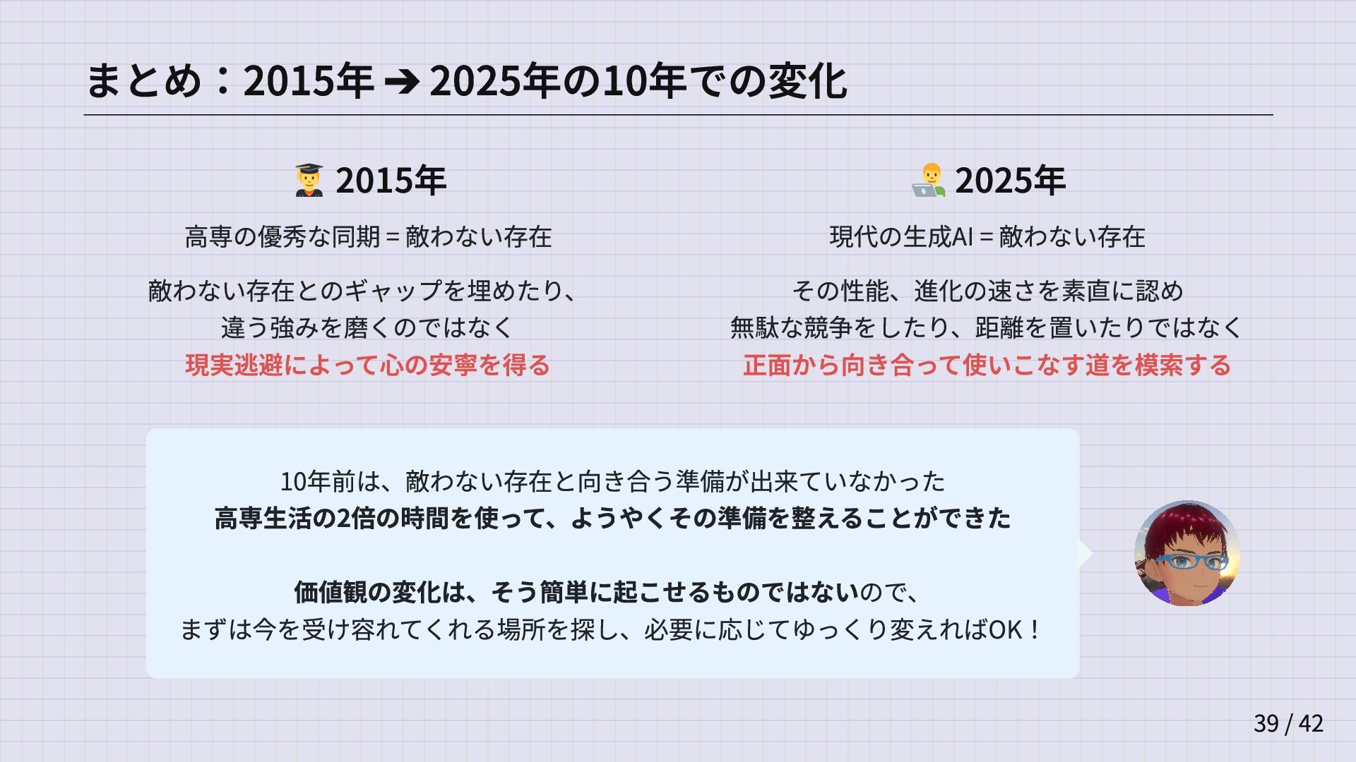 2025年 現代の生成AI = 敵わない存在 その性能、進化の速さを素直に認め 無駄な競争をしたり、距離を置いたりではなく 正面から向き合って使いこなす道を模索する 39 / 42 10年前は、敵わない存在と向き合う準備が出来ていなかった 高専生活の2倍の時間を使って、ようやくその準備を整えることができた 価値観の変化は、そう簡単に起こせるものではないので、 まずは今を受け容れてくれる場所を探し、必要に応じてゆっくり変えればOK!
