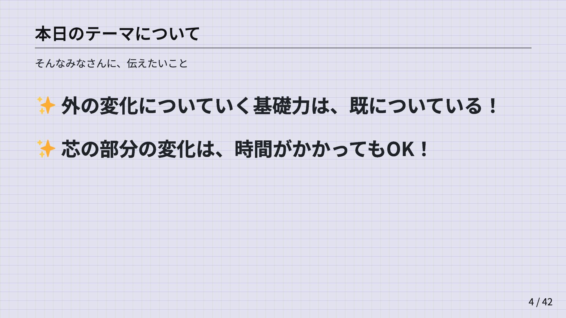 本日のテーマについて そんなみなさんに、伝えたいこと ️ 外の変化についていく基礎力は、既についている! ️ 芯の部分の変化は、時間がかかってもOK! 4 / 42