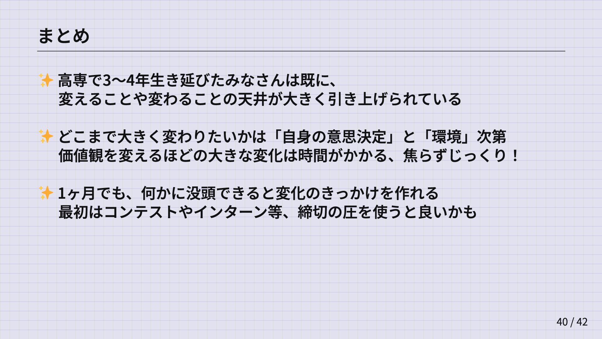 まとめ 高専で3〜4年生き延びたみなさんは既に、 変えることや変わることの天井が大きく引き上げられている どこまで大きく変わりたいかは「自身の意思決定」と「環境」次第 価値観を変えるほどの大きな変化は時間がかかる、焦らずじっくり! 1ヶ月でも、何かに没頭できると変化のきっかけを作れる 最初はコンテストやインターン等、締切の圧を使うと良いかも