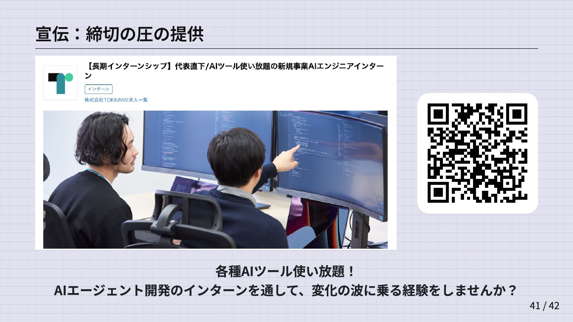宣伝:締切の圧の提供 各種AIツール使い放題! AIエージェント開発のインターンを通して、変化の波に乗る経験をしませんか? 41 / 42