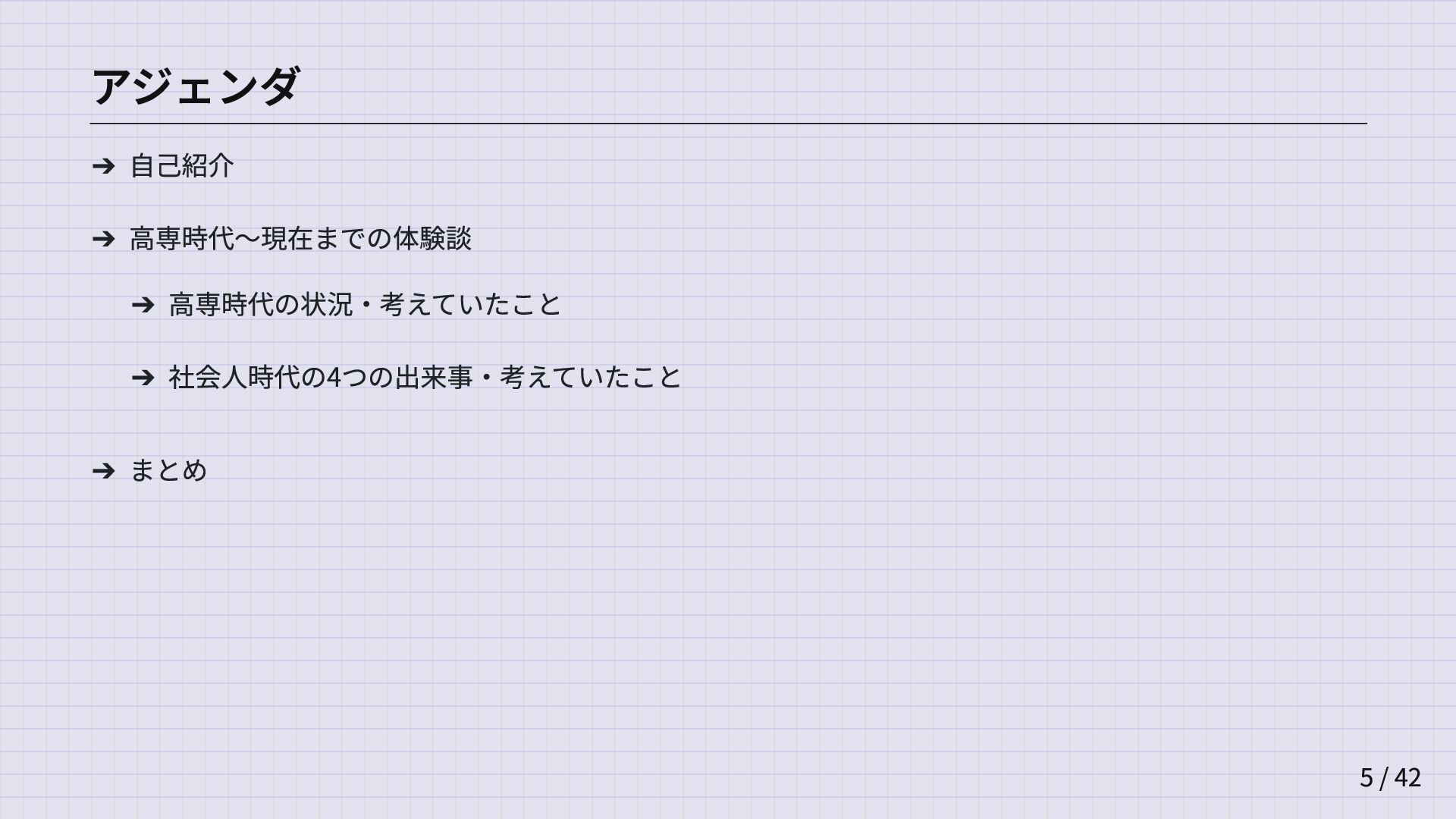 アジェンダ ➔ 自己紹介 ➔ 高専時代〜現在までの体験談 ➔ 高専時代の状況・考えていたこと ➔ 社会人時代の4つの出来事・考えていたこと ➔