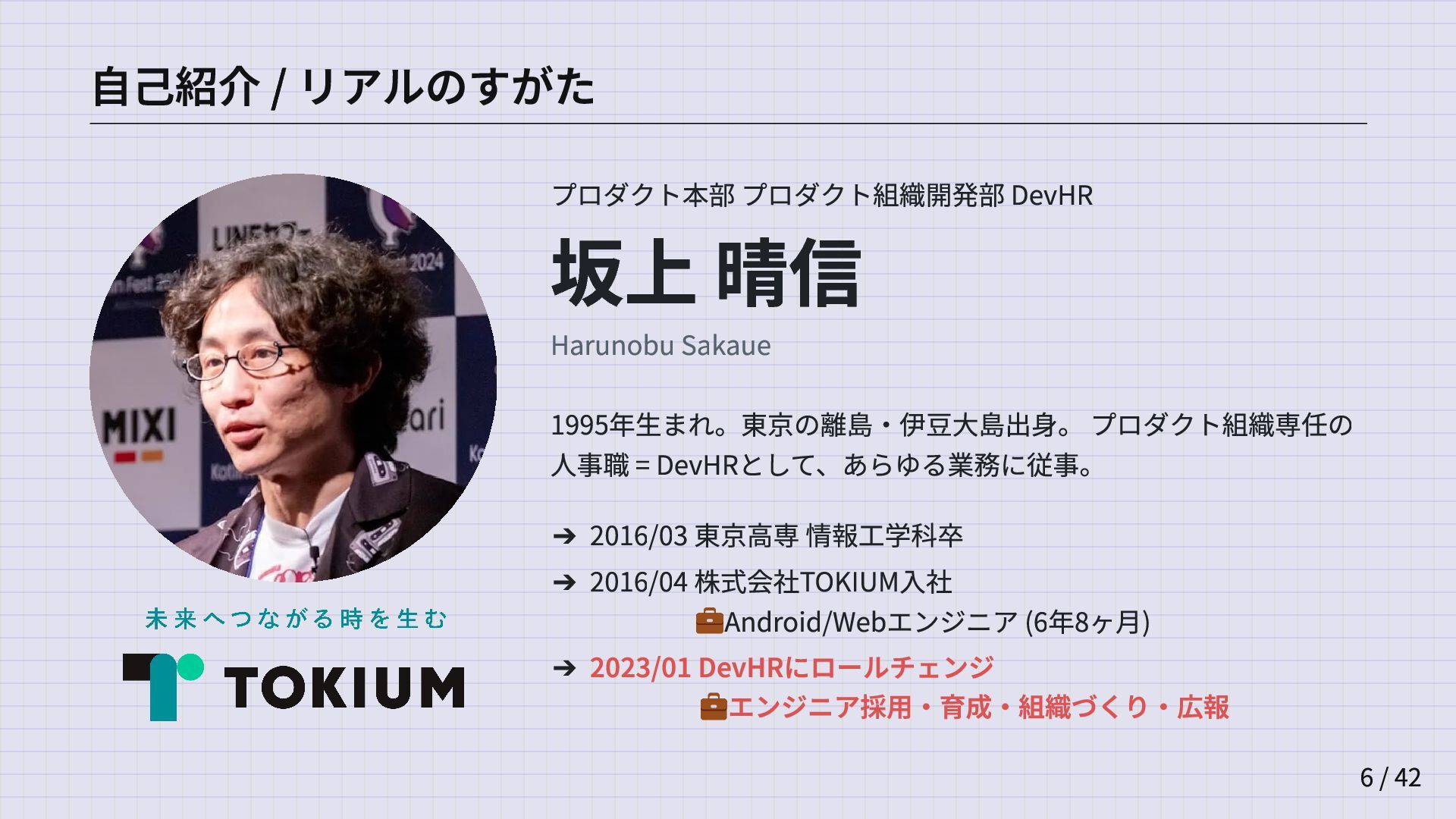 1995年生まれ。東京の離島・伊豆大島出身。 プロダクト組織専任の 人事職 = DevHRとして、あらゆる業務に従事。 ➔ 2016/03 東京高専 情報工学科卒 ➔ 2016/04 株式会社TOKIUM入社 Android/Webエンジニア (6年8ヶ月) ➔ 2023/01 DevHRにロールチェンジ エンジニア採用・育成・組織づくり・広報 6 / 42