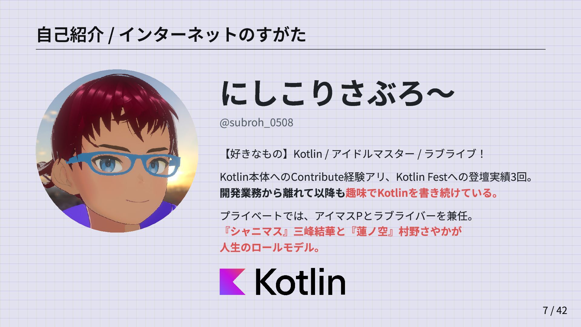 自己紹介 / インターネットのすがた にしこりさぶろ〜 @subroh_0508 【好きなもの】Kotlin / アイドルマスター / ラブライブ!