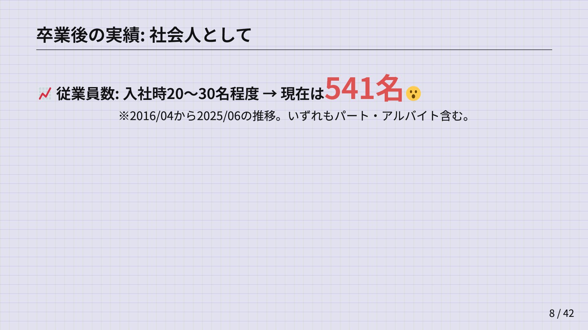 卒業後の実績: 社会人として 従業員数: 入社時20〜30名程度 → 現在は 541名 ※2016/04から2025/06の推移。いずれもパート・アルバイト含む。 8 /