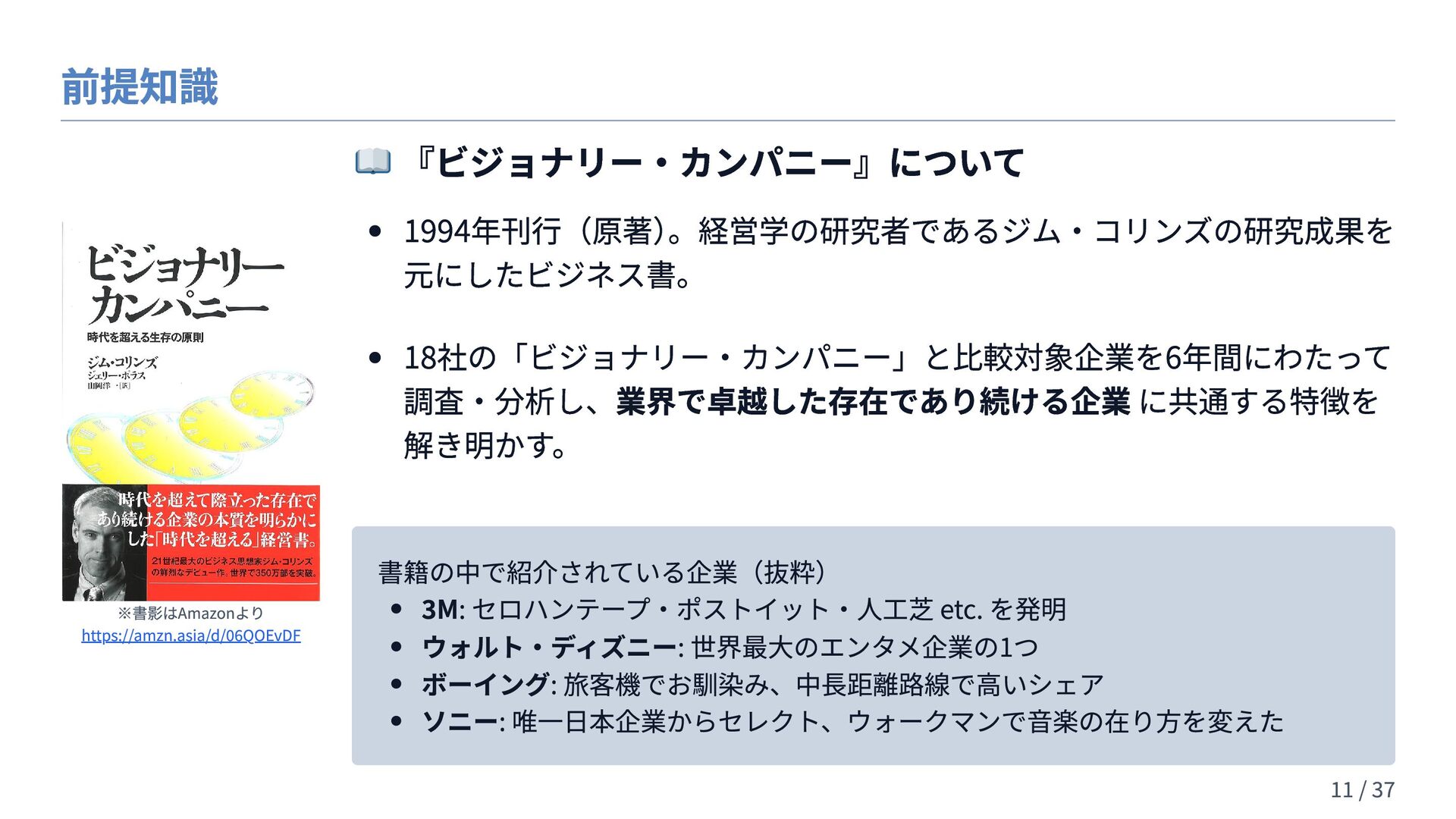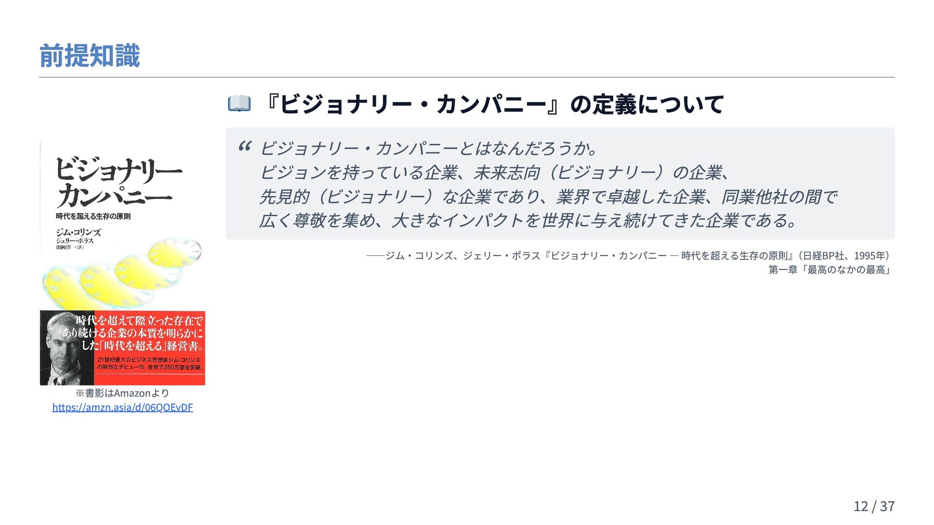 ビジョンを持っている企業、未来志向(ビジョナリー)の企業、 先見的(ビジョナリー)な企業であり、業界で卓越した企業、同業他社の間で 広く尊敬を集め、大きなインパクトを世界に与え続けてきた企業である。 “ 12 / 37