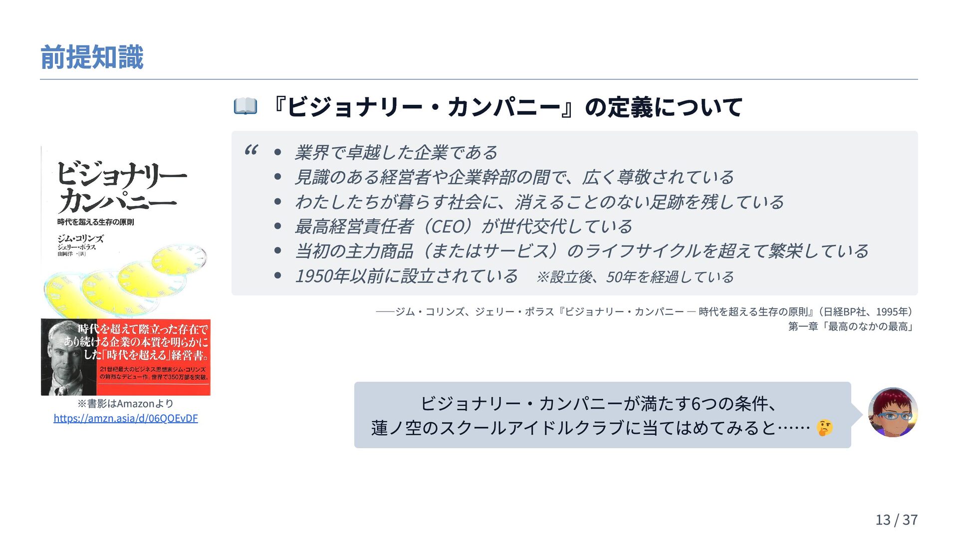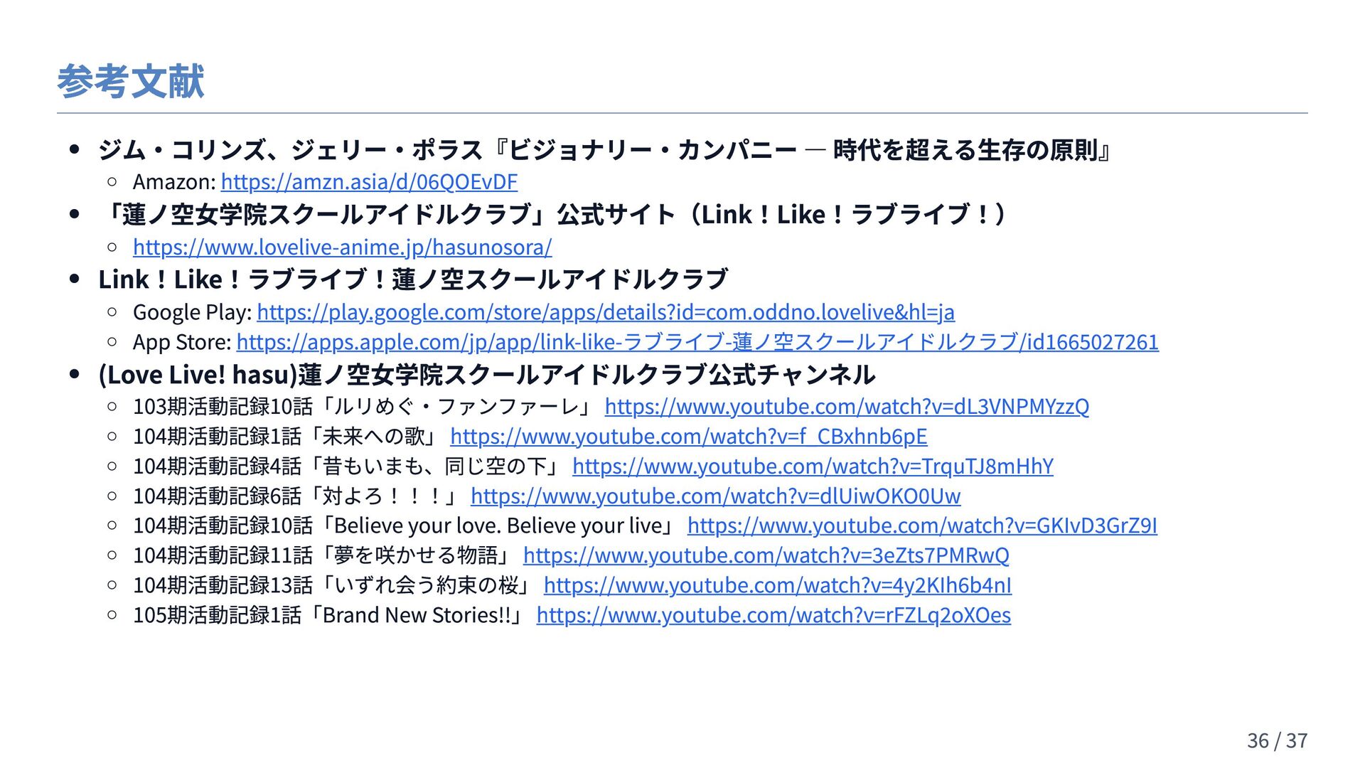 ジム・コリンズ、ジェリー・ポラス『ビジョナリー・カンパニー ― 時代を超える生存の原則』 Amazon: https://amzn.asia/d/06QOEvDF 「蓮ノ空女学院スクールアイドルクラブ」公式サイト(Link!Like!ラブライブ!) https://www.lovelive-anime.jp/hasunosora/ Link!Like!ラブライブ!蓮ノ空スクールアイドルクラブ Google Play: