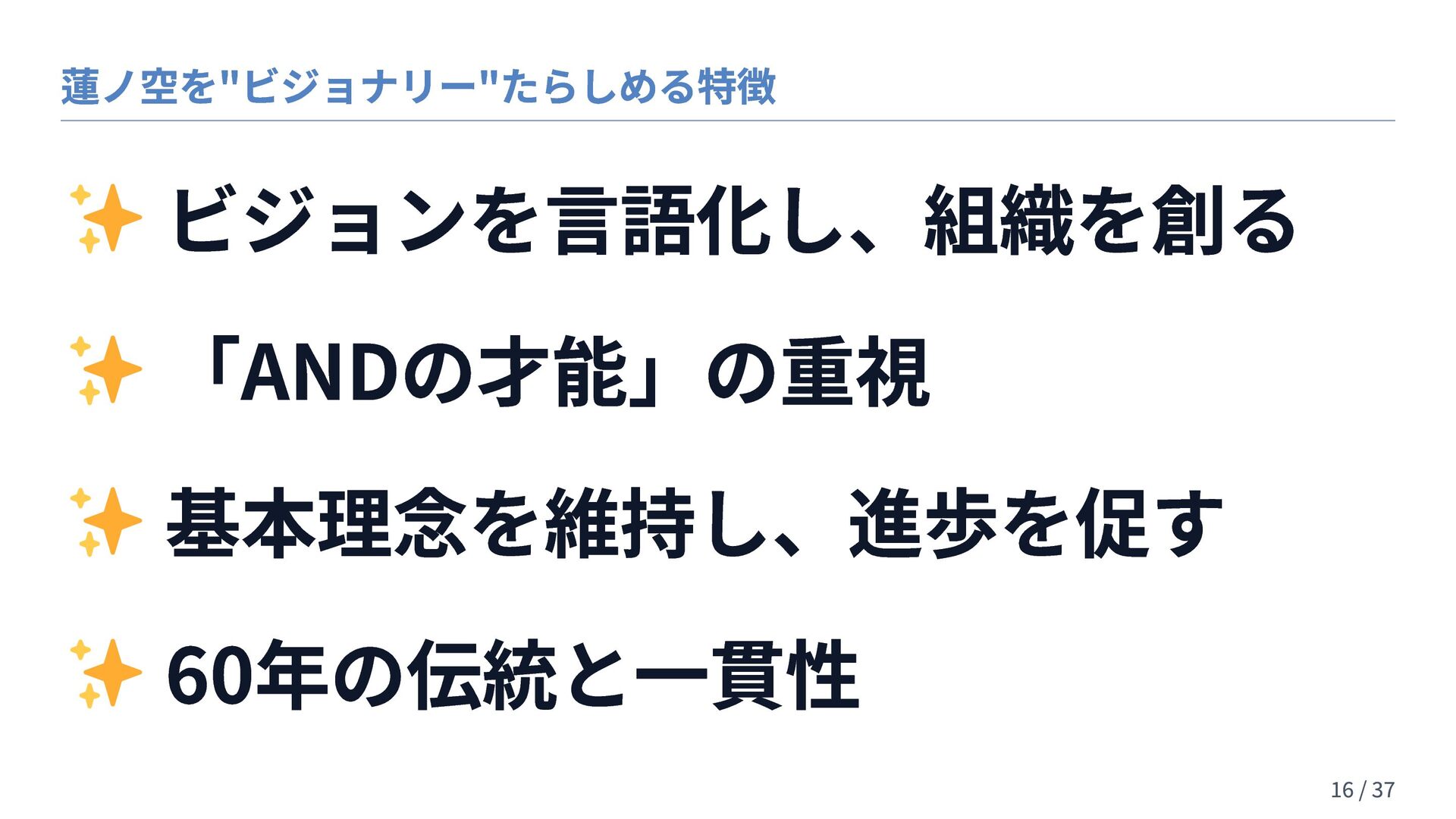 ビジョンを言語化し、組織を創る 「ANDの才能」の重視 基本理念を維持し、進歩を促す 60年の伝統と一貫性 蓮ノ空を"ビジョナリー"たらしめる特徴 16 / 37