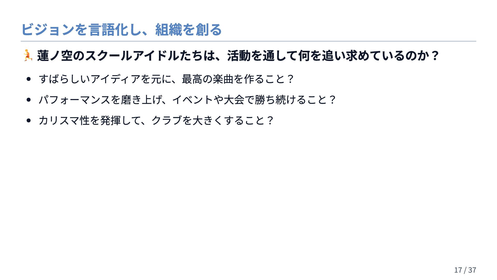 蓮ノ空のスクールアイドルたちは、活動を通して何を追い求めているのか? すばらしいアイディアを元に、最高の楽曲を作ること? パフォーマンスを磨き上げ、イベントや大会で勝ち続けること? カリスマ性を発揮して、クラブを大きくすること? ビジョンを言語化し、組織を創る 17 / 37