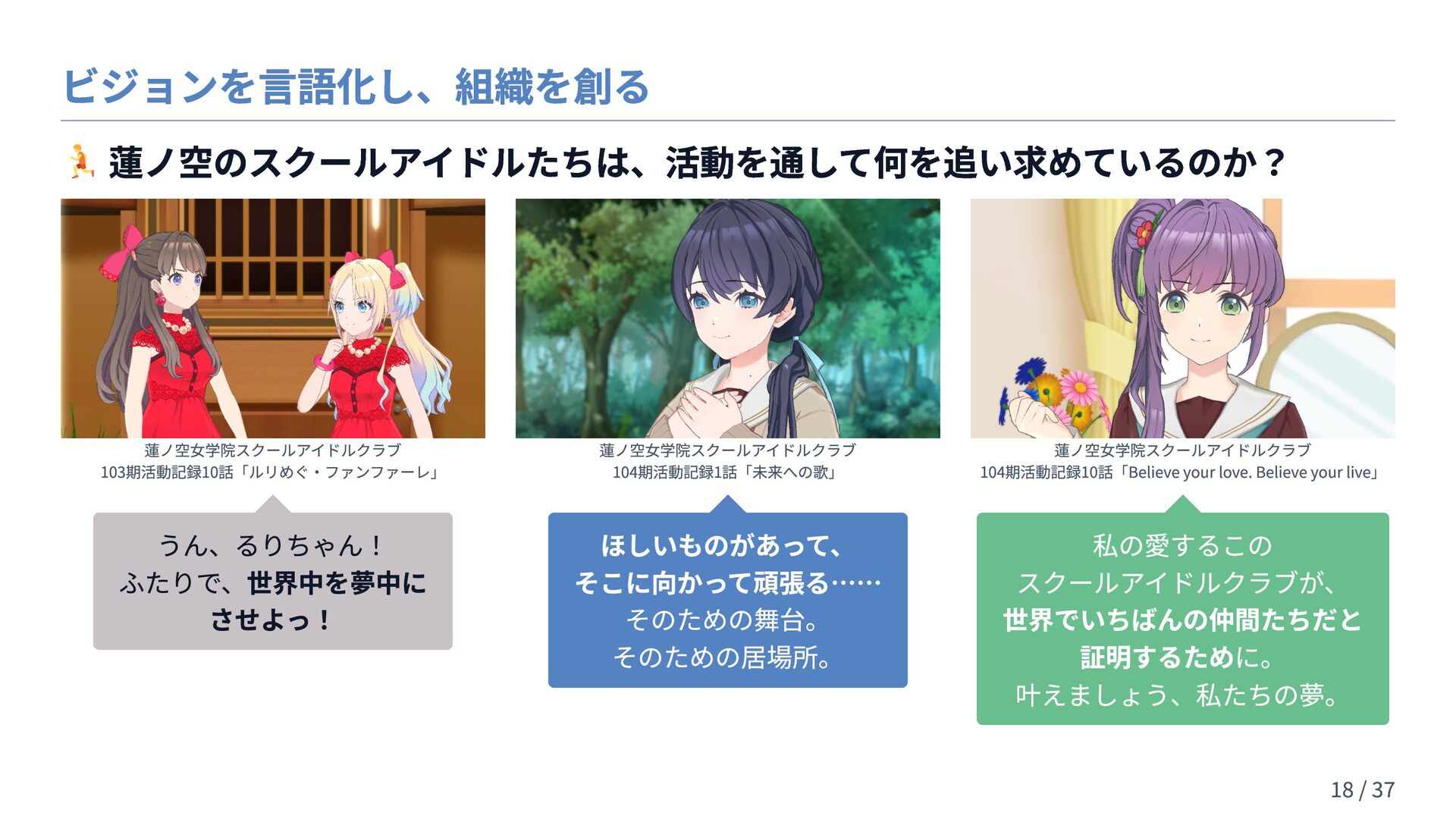 your live」 ビジョンを言語化し、組織を創る うん、るりちゃん! ふたりで、世界中を夢中に させよっ! ほしいものがあって、 そこに向かって頑張る…… そのための舞台。 そのための居場所。 私の愛するこの スクールアイドルクラブが、 世界でいちばんの仲間たちだと 証明するために。 叶えましょう、私たちの夢。 18 / 37
