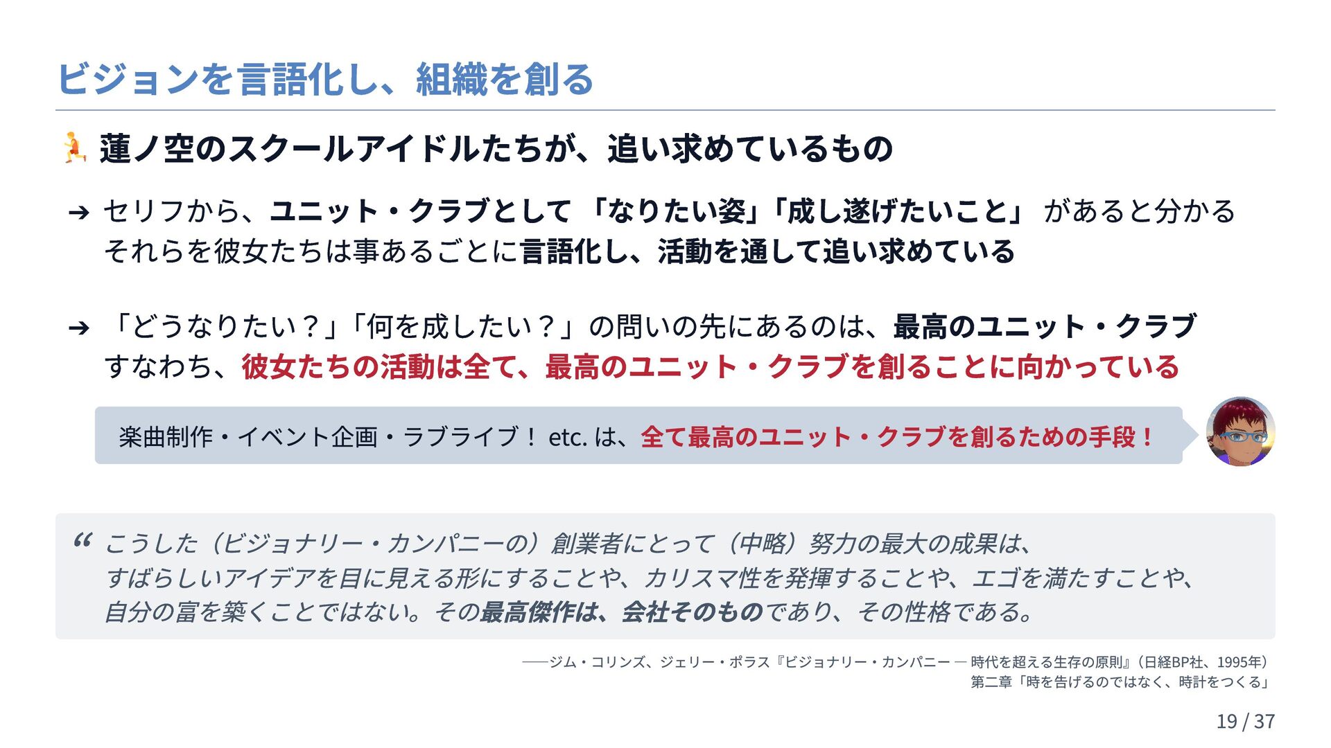 すなわち、彼女たちの活動は全て、最高のユニット・クラブを創ることに向かっている ――ジム・コリンズ、ジェリー・ポラス『ビジョナリー・カンパニー ― 時代を超える生存の原則』 (日経BP社、1995年) 第二章「時を告げるのではなく、時計をつくる」 ビジョンを言語化し、組織を創る 楽曲制作・イベント企画・ラブライブ! etc. は、全て最高のユニット・クラブを創るための手段! こうした(ビジョナリー・カンパニーの)創業者にとって(中略)努力の最大の成果は、 すばらしいアイデアを目に見える形にすることや、カリスマ性を発揮することや、エゴを満たすことや、 自分の富を築くことではない。その最高傑作は、会社そのものであり、その性格である。 “ 19 / 37