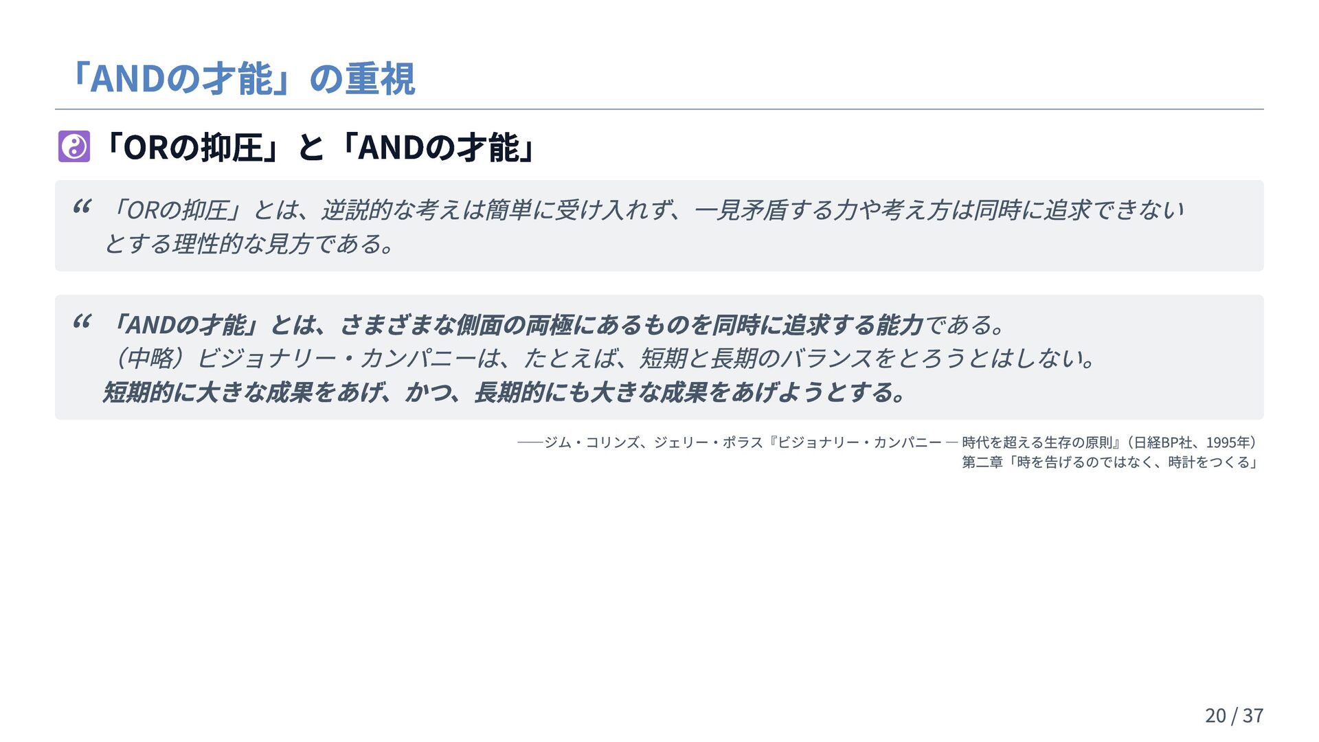 「ANDの才能」とは、さまざまな側面の両極にあるものを同時に追求する能力である。 (中略)ビジョナリー・カンパニーは、たとえば、短期と長期のバランスをとろうとはしない。 短期的に大きな成果をあげ、かつ、長期的にも大きな成果をあげようとする。 “ 20 / 37