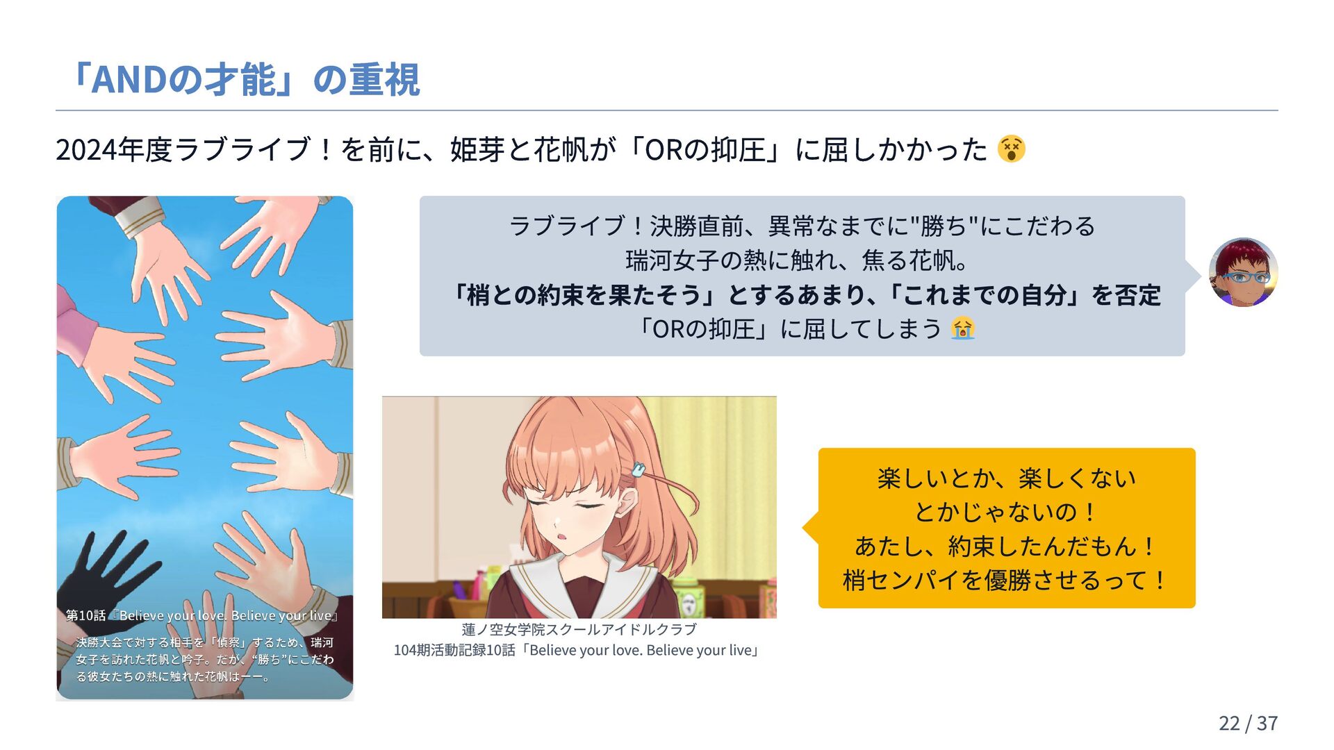 2024年度ラブライブ!を前に、姫芽と花帆が「ORの抑圧」に屈しかかった 蓮ノ空女学院スクールアイドルクラブ 104期活動記録10話「Believe your love. Believe your live」 「ANDの才能」の重視 ラブライブ!決勝直前、異常なまでに"勝ち"にこだわる