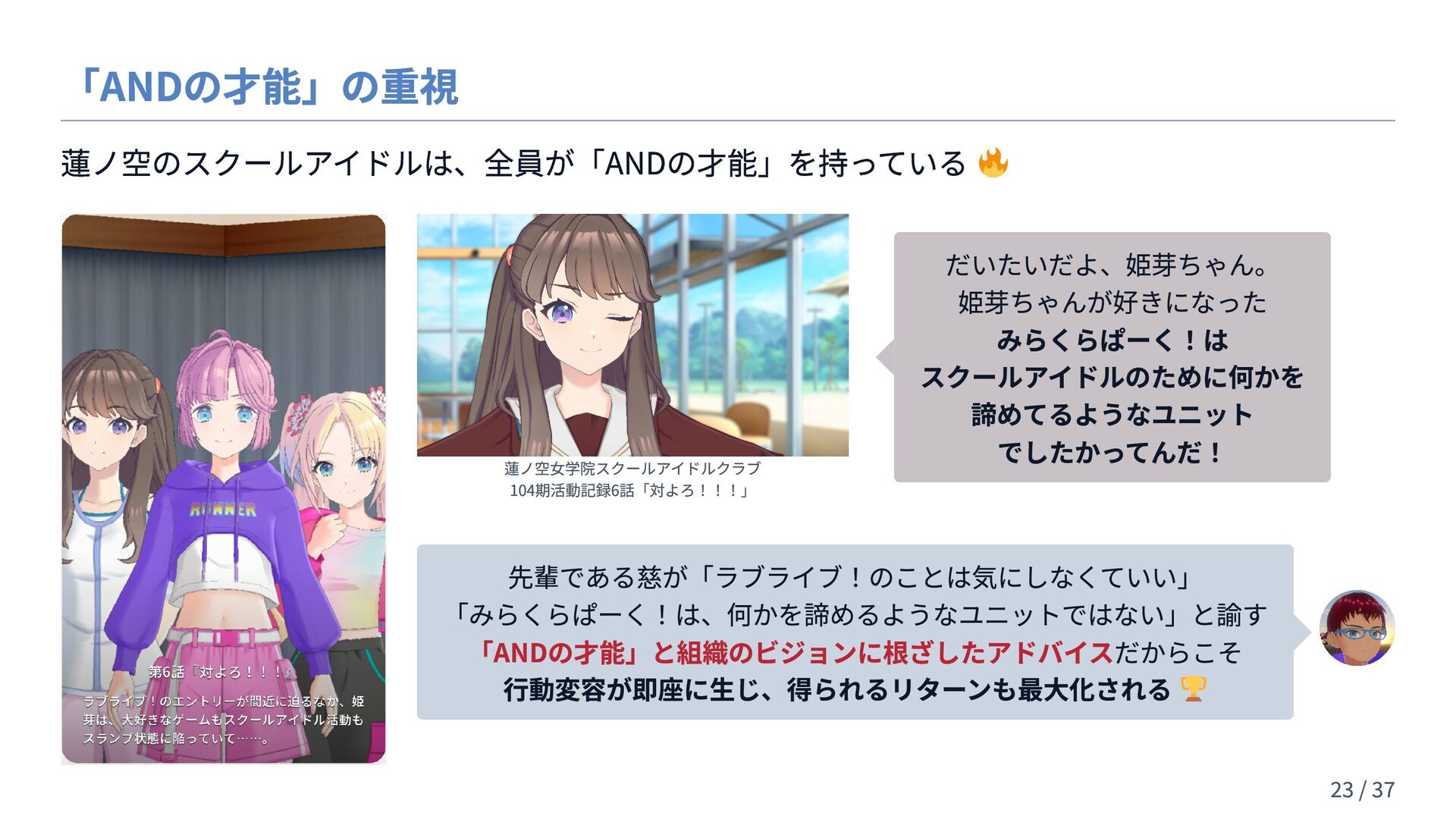 先輩である慈が「ラブライブ!のことは気にしなくていい」 「みらくらぱーく!は、何かを諦めるようなユニットではない」と諭す 「ANDの才能」と組織のビジョンに根ざしたアドバイスだからこそ 行動変容が即座に生じ、得られるリターンも最大化される 23 / 37