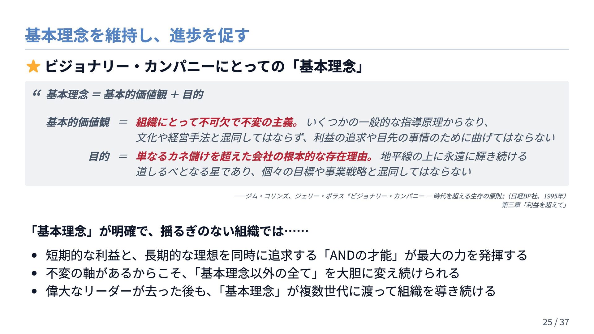 ビジョナリー・カンパニーにとっての「基本理念」 ――ジム・コリンズ、ジェリー・ポラス『ビジョナリー・カンパニー ― 時代を超える生存の原則』 (日経BP社、1995年) 第三章「利益を超えて」 「基本理念」が明確で、揺るぎのない組織では…… 短期的な利益と、長期的な理想を同時に追求する「ANDの才能」が最大の力を発揮する 不変の軸があるからこそ、 「基本理念以外の全て」を大胆に変え続けられる