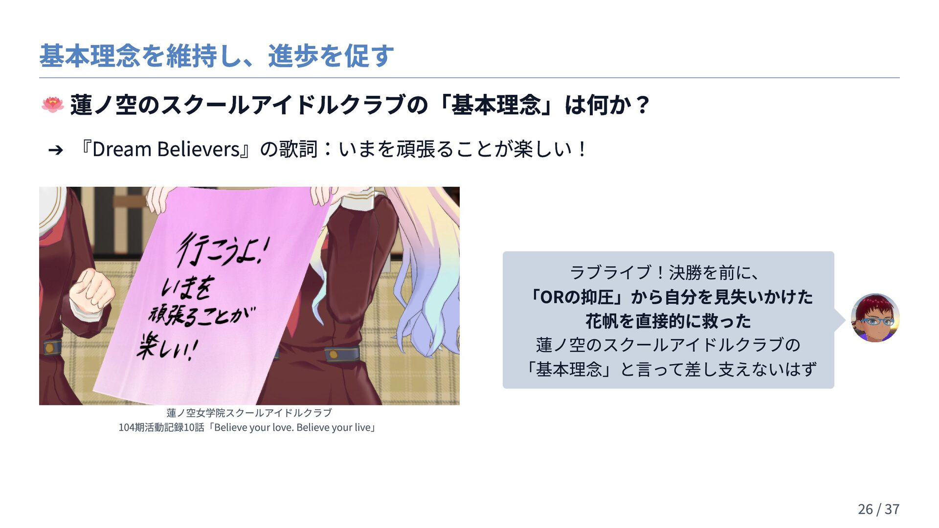 live」 基本理念を維持し、進歩を促す ラブライブ!決勝を前に、 「ORの抑圧」から自分を見失いかけた 花帆を直接的に救った 蓮ノ空のスクールアイドルクラブの 「基本理念」と言って差し支えないはず 26 / 37