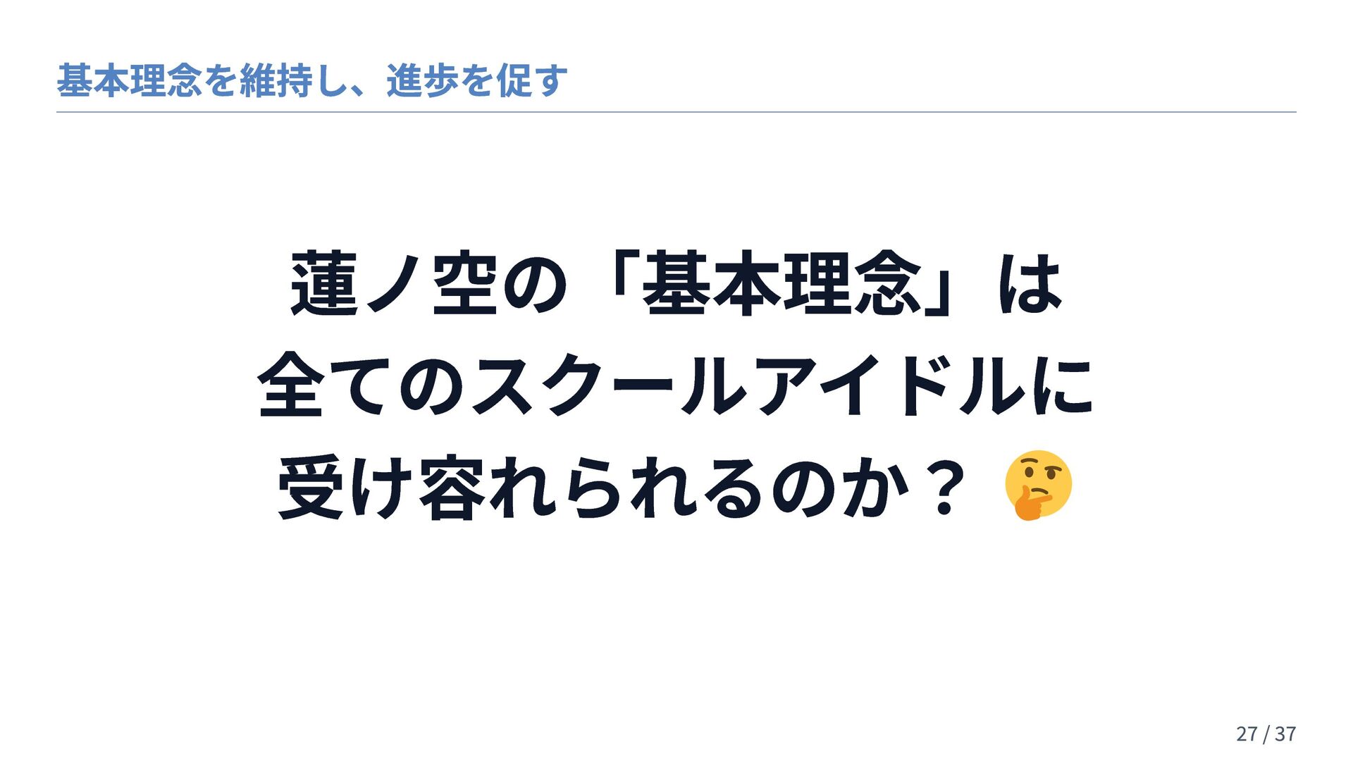 蓮ノ空の「基本理念」は 全てのスクールアイドルに 受け容れられるのか? 基本理念を維持し、進歩を促す 27 / 37