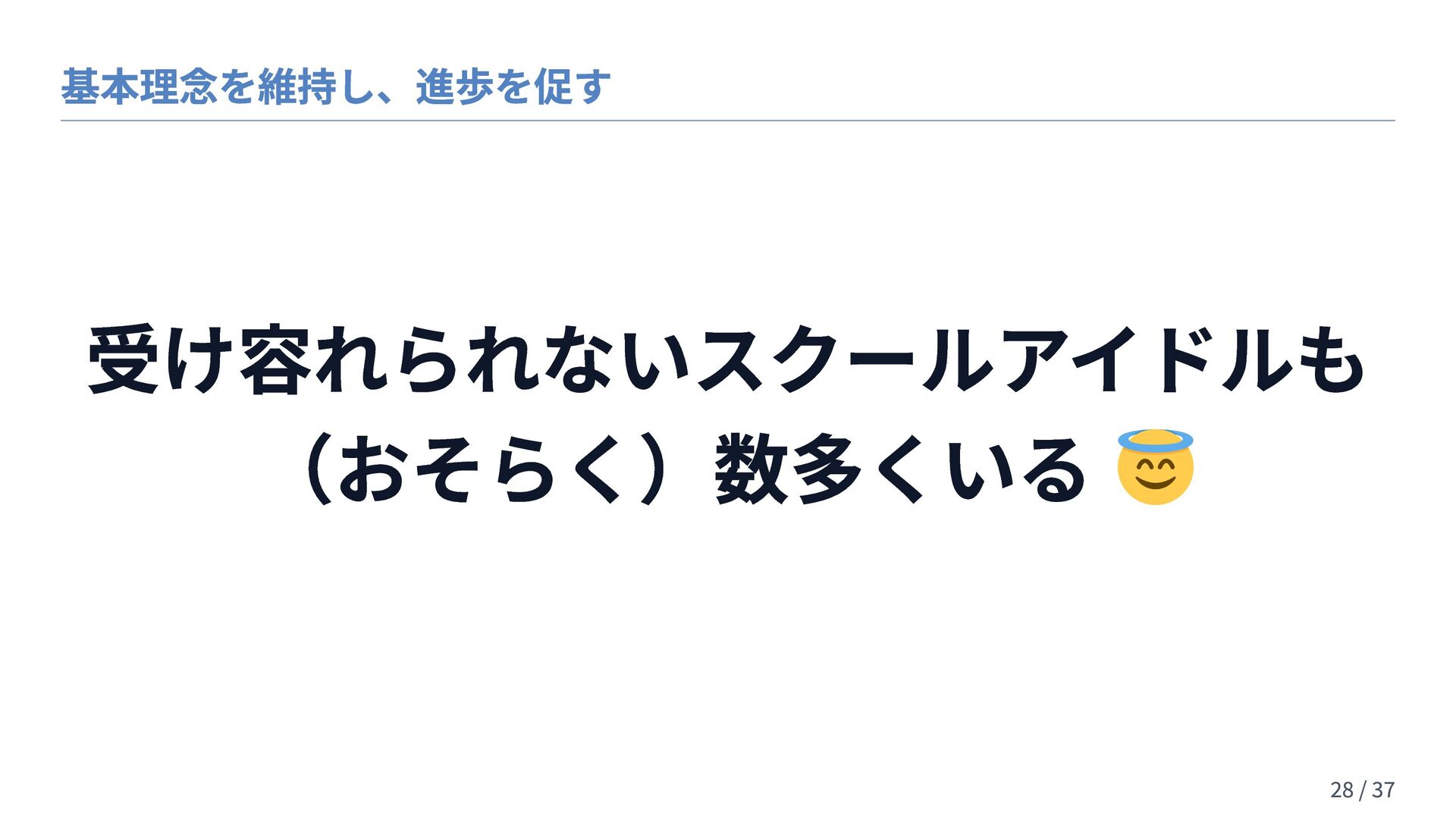 受け容れられないスクールアイドルも (おそらく)数多くいる 基本理念を維持し、進歩を促す 28 / 37
