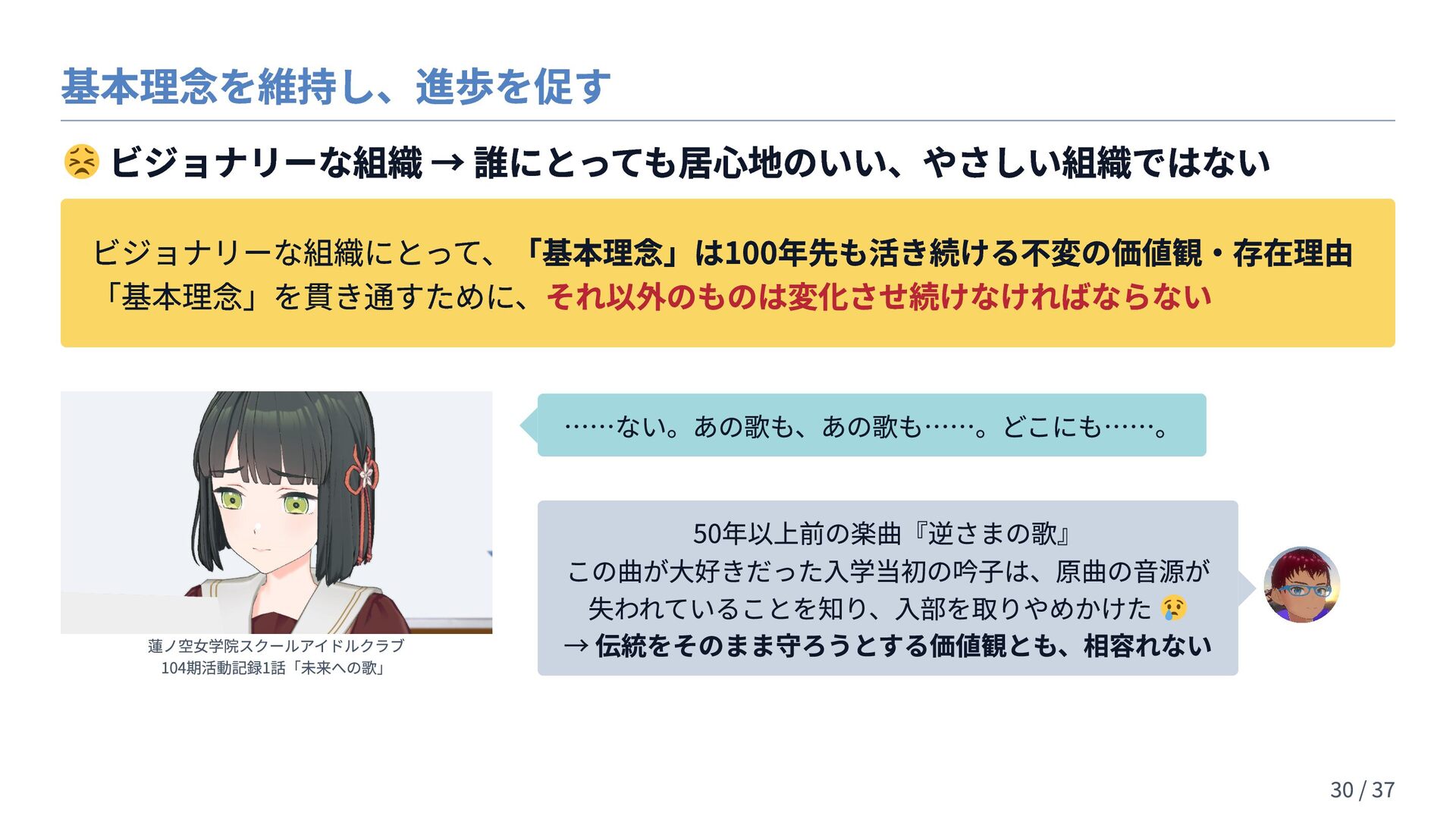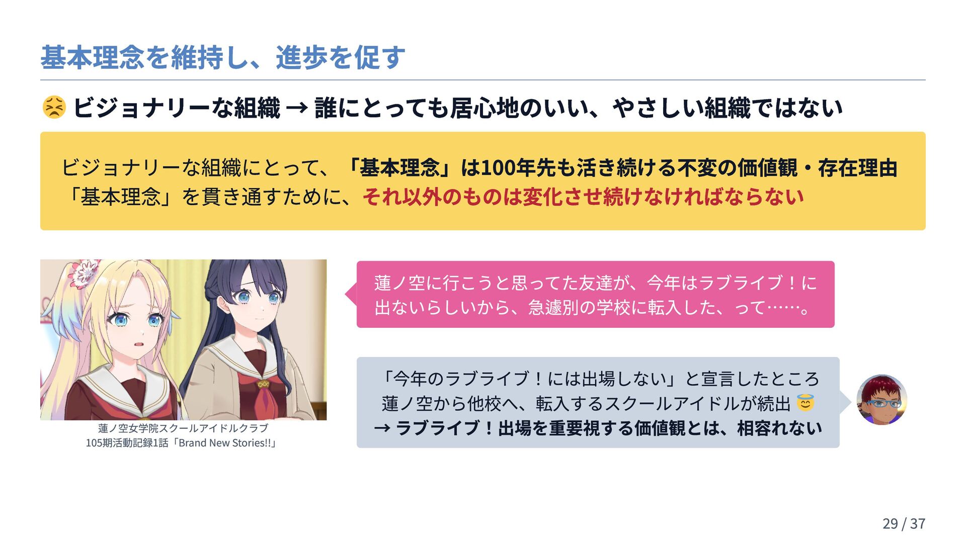 ビジョナリーな組織 → 誰にとっても居心地のいい、やさしい組織ではない ビジョナリーな組織にとって、「基本理念」は100年先も活き続ける不変の価値観・存在理由 「基本理念」を貫き通すために、それ以外のものは変化させ続けなければならない 蓮ノ空女学院スクールアイドルクラブ 105期活動記録1話「Brand New Stories!!」 基本理念を維持し、進歩を促す