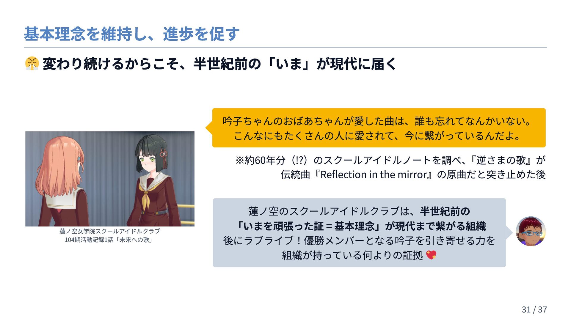 吟子ちゃんのおばあちゃんが愛した曲は、誰も忘れてなんかいない。 こんなにもたくさんの人に愛されて、今に繋がっているんだよ。 蓮ノ空のスクールアイドルクラブは、半世紀前の 「いまを頑張った証 = 基本理念」が現代まで繋がる組織 後にラブライブ!優勝メンバーとなる吟子を引き寄せる力を 組織が持っている何よりの証拠 31 / 37