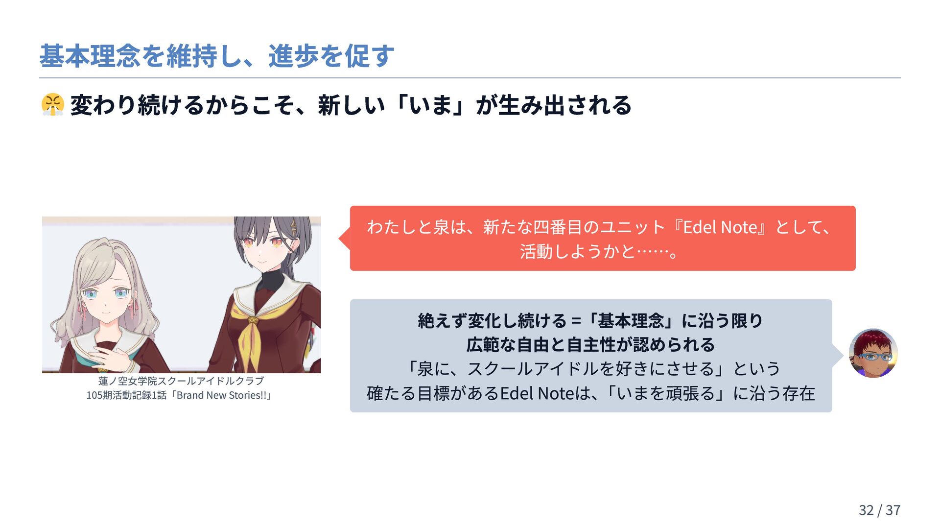 =「基本理念」に沿う限り 広範な自由と自主性が認められる 「泉に、スクールアイドルを好きにさせる」という 確たる目標があるEdel Noteは、 「いまを頑張る」に沿う存在 32 / 37