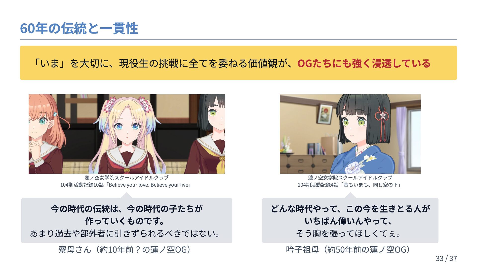 104期活動記録4話「昔もいまも、同じ空の下」 吟子祖母(約50年前の蓮ノ空OG) 60年の伝統と一貫性 今の時代の伝統は、今の時代の子たちが 作っていくものです。 あまり過去や部外者に引きずられるべきではない。 どんな時代やって、この今を生きとる人が いちばん偉いんやって、 そう胸を張ってほしくてぇ。 33 / 37