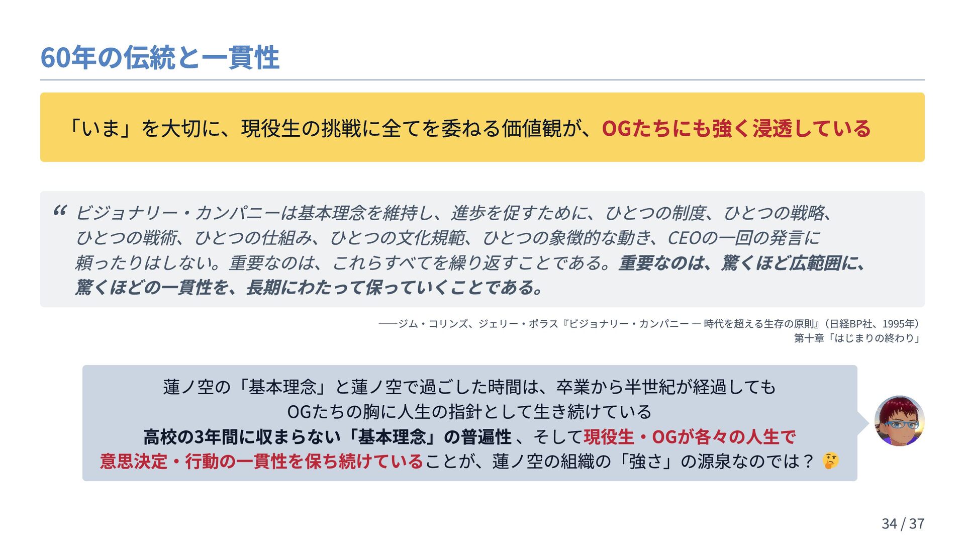 驚くほどの一貫性を、長期にわたって保っていくことである。 “ 蓮ノ空の「基本理念」と蓮ノ空で過ごした時間は、卒業から半世紀が経過しても OGたちの胸に人生の指針として生き続けている 高校の3年間に収まらない「基本理念」の普遍性 、そして現役生・OGが各々の人生で 意思決定・行動の一貫性を保ち続けていることが、蓮ノ空の組織の「強さ」の源泉なのでは? 34 / 37