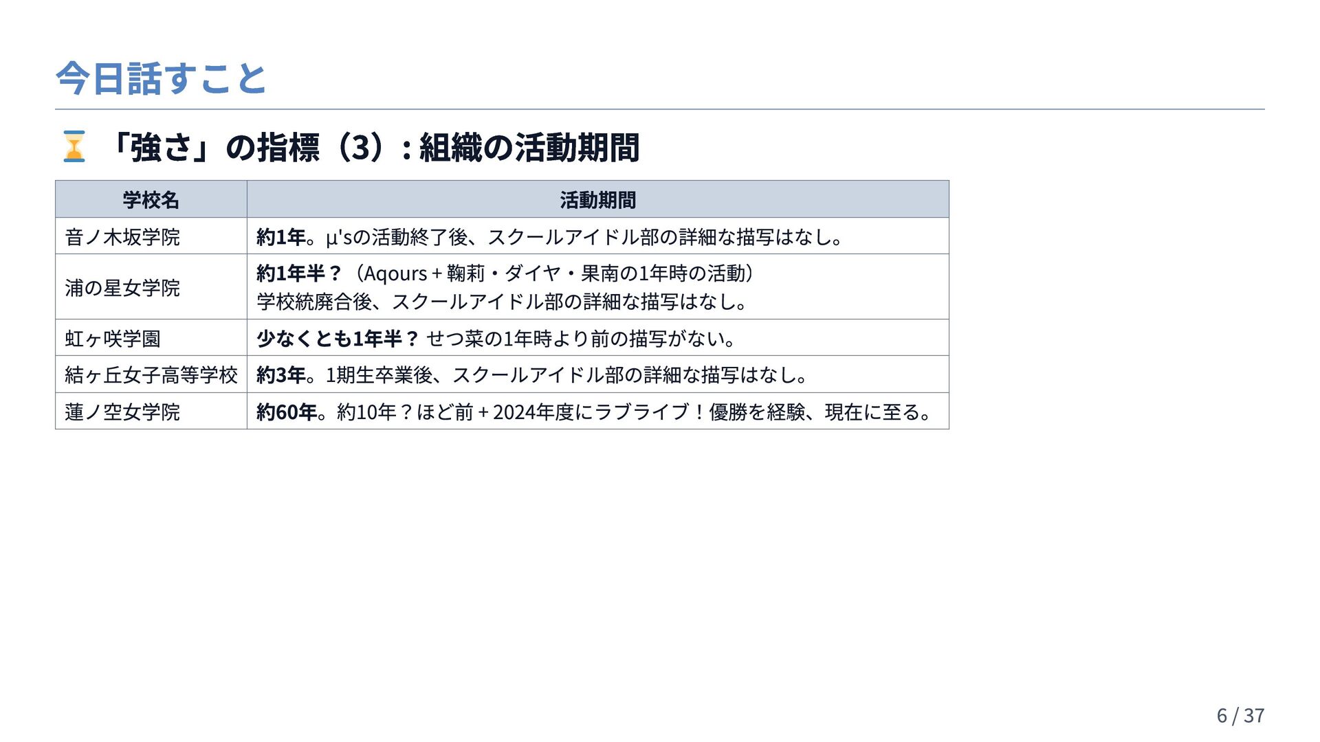 + 鞠莉・ダイヤ・果南の1年時の活動) 学校統廃合後、スクールアイドル部の詳細な描写はなし。 虹ヶ咲学園 少なくとも1年半? せつ菜の1年時より前の描写がない。 結ヶ丘女子高等学校 約3年。1期生卒業後、スクールアイドル部の詳細な描写はなし。 蓮ノ空女学院 約60年。約10年?ほど前 + 2024年度にラブライブ!優勝を経験、現在に至る。 今日話すこと 6 / 37