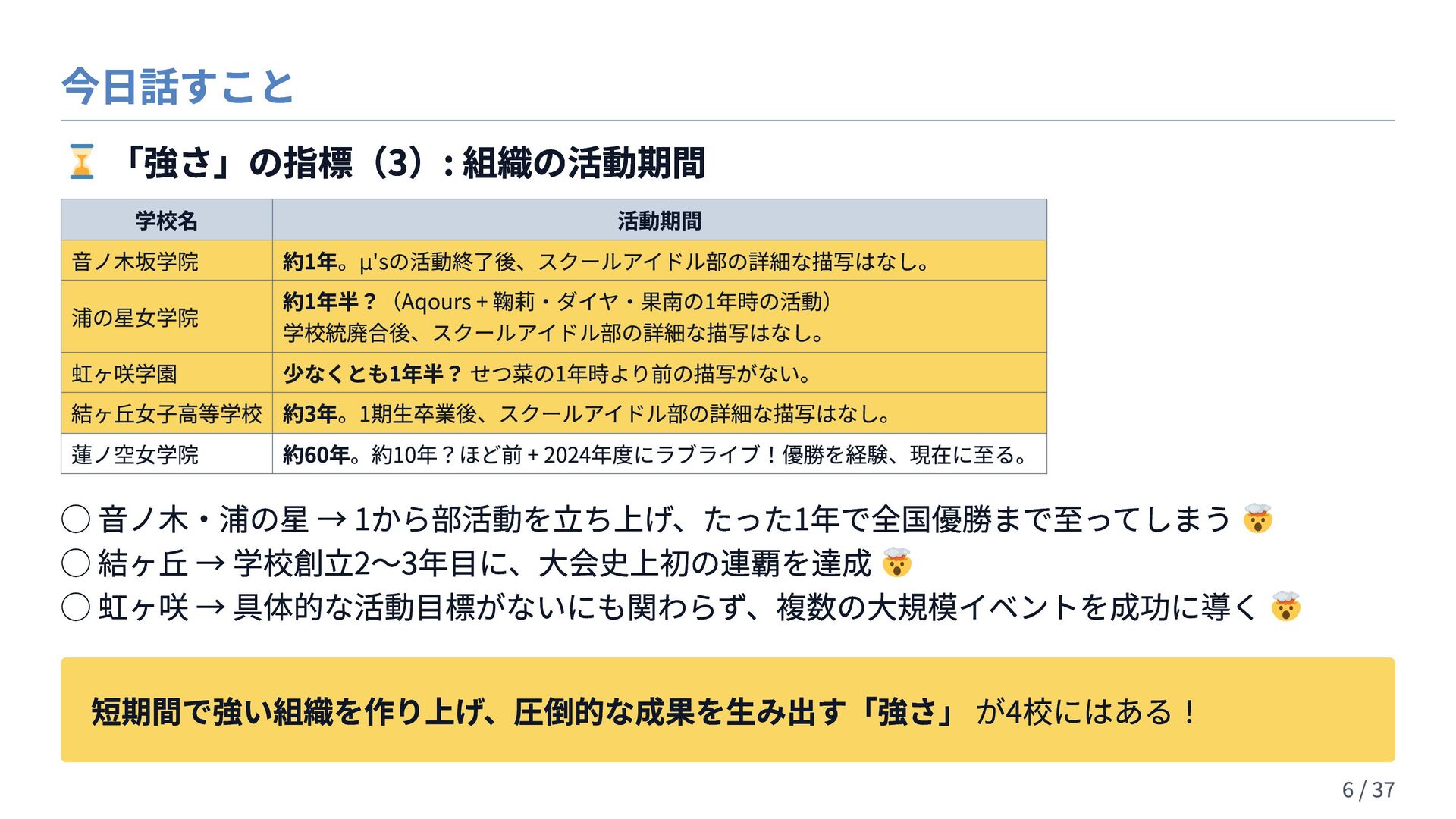 + 鞠莉・ダイヤ・果南の1年時の活動) 学校統廃合後、スクールアイドル部の詳細な描写はなし。 虹ヶ咲学園 少なくとも1年半? せつ菜の1年時より前の描写がない。 結ヶ丘女子高等学校 約3年。1期生卒業後、スクールアイドル部の詳細な描写はなし。 蓮ノ空女学院 約60年。約10年?ほど前 + 2024年度にラブライブ!優勝を経験、現在に至る。 ◯ 音ノ木・浦の星 → 1から部活動を立ち上げ、たった1年で全国優勝まで至ってしまう ◯ 結ヶ丘 → 学校創立2〜3年目に、大会史上初の連覇を達成 ◯ 虹ヶ咲 → 具体的な活動目標がないにも関わらず、複数の大規模イベントを成功に導く 短期間で強い組織を作り上げ、圧倒的な成果を生み出す「強さ」 が4校にはある! 今日話すこと 6 / 37