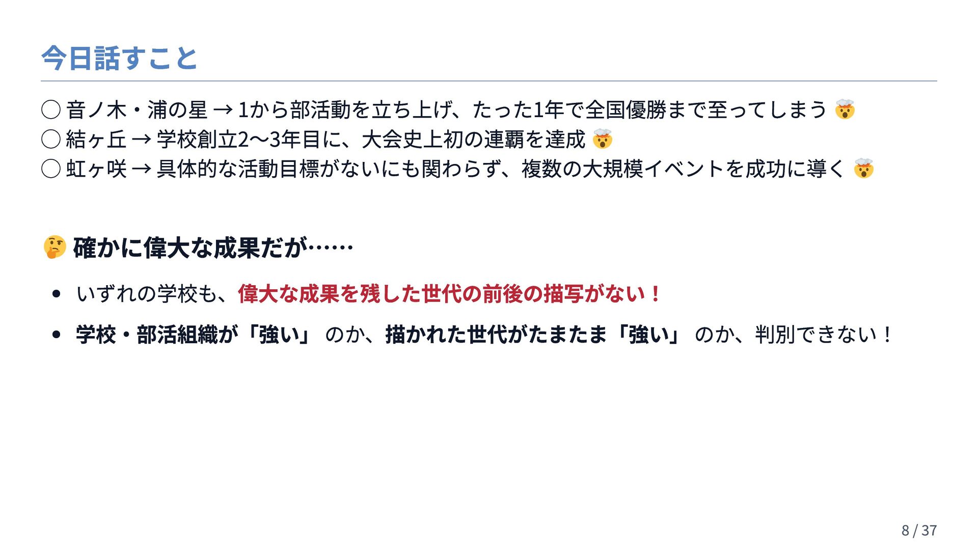 → 具体的な活動目標がないにも関わらず、複数の大規模イベントを成功に導く 確かに偉大な成果だが…… いずれの学校も、偉大な成果を残した世代の前後の描写がない! 学校・部活組織が「強い」 のか、描かれた世代がたまたま「強い」 のか、判別できない! 今日話すこと 8 / 37