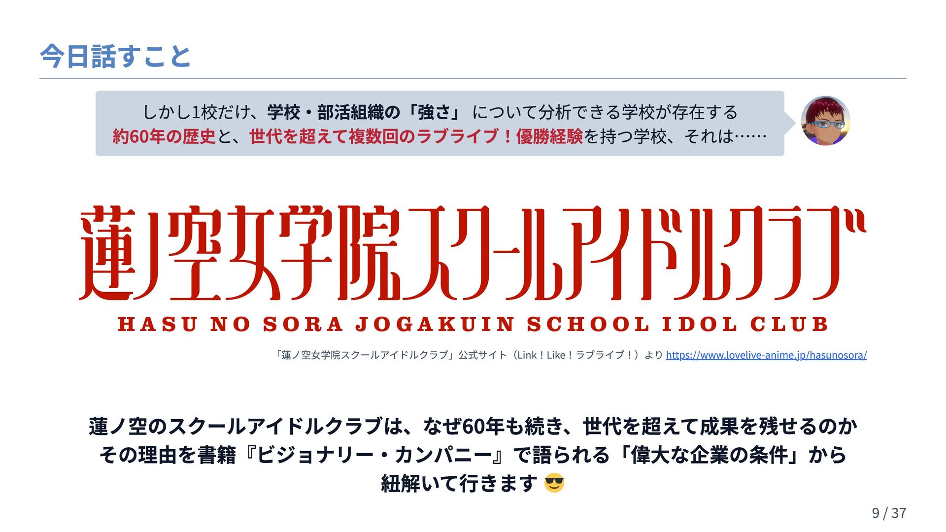 「蓮ノ空女学院スクールアイドルクラブ」公式サイト(Link!Like!ラブライブ!)より https://www.lovelive-anime.jp/hasunosora/ 蓮ノ空のスクールアイドルクラブは、なぜ60年も続き、世代を超えて成果を残せるのか その理由を書籍『ビジョナリー・カンパニー』で語られる「偉大な企業の条件」から 紐解いて行きます 今日話すこと しかし1校だけ、学校・部活組織の「強さ」 について分析できる学校が存在する 約60年の歴史と、世代を超えて複数回のラブライブ!優勝経験を持つ学校、それは…… 9