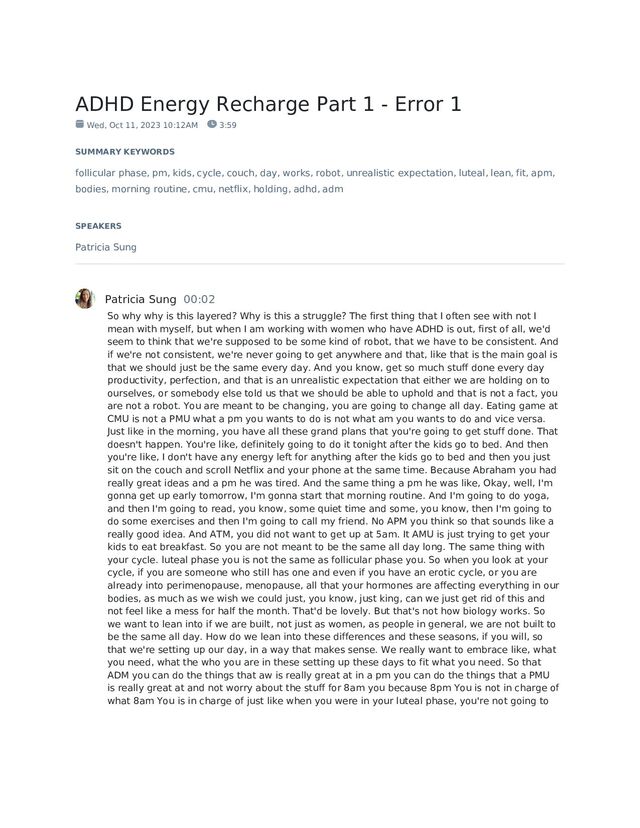11, 2023 10:12AM 3:59 SUMMARY KEYWORDS follicular phase, pm, kids, cycle, couch, day, works, robot, unrealistic expectation, luteal, lean, fit, apm, bodies, morning routine, cmu, netflix, holding, adhd, adm SPEAKERS Patricia Sung Patricia Sung 00:02 So why why is this layered? Why is this a struggle? The first thing that I often see with not I mean with myself, but when I am working with women who have ADHD is out, first of all, we'd seem to think that we're supposed to be some kind of robot, that we have to be consistent. And if we're not consistent, we're never going to get anywhere and that, like that is the main goal is that we should just be the same every day. And you know, get so much stuff done every day productivity, perfection, and that is an unrealistic expectation that either we are holding on to ourselves, or somebody else told us that we should be able to uphold and that is not a fact, you are not a robot. You are meant to be changing, you are going to change all day. Eating game at CMU is not a PMU what a pm you wants to do is not what am you wants to do and vice versa. Just like in the morning, you have all these grand plans that you're going to get stuff done. That doesn't happen. You're like, definitely going to do it tonight after the kids go to bed. And then you're like, I don't have any energy left for anything after the kids go to bed and then you just sit on the couch and scroll Netflix and your phone at the same time. Because Abraham you had really great ideas and a pm he was tired. And the same thing a pm he was like, Okay, well, I'm gonna get up early tomorrow, I'm gonna start that morning routine. And I'm going to do yoga, and then I'm going to read, you know, some quiet time and some, you know, then I'm going to do some exercises and then I'm going to call my friend. No APM you think so that sounds like a really good idea. And ATM, you did not want to get up at 5am. It AMU is just trying to get your kids to eat breakfast. So you are not meant to be the same all day long. The same thing with your cycle. luteal phase you is not the same as follicular phase you. So when you look at your cycle, if you are someone who still has one and even if you have an erotic cycle, or you are already into perimenopause, menopause, all that your hormones are affecting everything in our bodies, as much as we wish we could just, you know, just king, can we just get rid of this and not feel like a mess for half the month. That'd be lovely. But that's not how biology works. So we want to lean into if we are built, not just as women, as people in general, we are not built to be the same all day. How do we lean into these differences and these seasons, if you will, so that we're setting up our day, in a way that makes sense. We really want to embrace like, what you need, what the who you are in these setting up these days to fit what you need. So that ADM you can do the things that aw is really great at in a pm you can do the things that a PMU is really great at and not worry about the stuff for 8am you because 8pm You is not in charge of what 8am You is in charge of just like when you were in your luteal phase, you're not going to