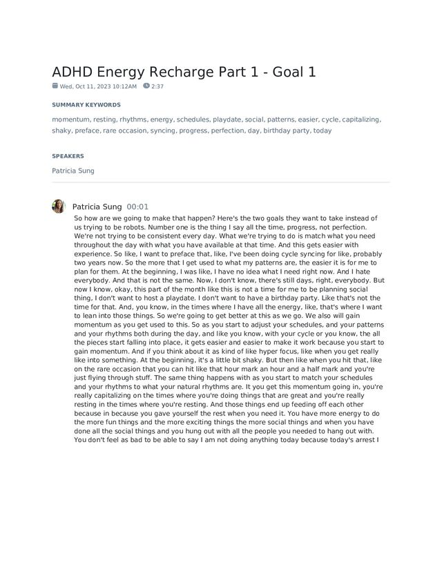 11, 2023 10:12AM 2:37 SUMMARY KEYWORDS momentum, resting, rhythms, energy, schedules, playdate, social, patterns, easier, cycle, capitalizing, shaky, preface, rare occasion, syncing, progress, perfection, day, birthday party, today SPEAKERS Patricia Sung Patricia Sung 00:01 So how are we going to make that happen? Here's the two goals they want to take instead of us trying to be robots. Number one is the thing I say all the time, progress, not perfection. We're not trying to be consistent every day. What we're trying to do is match what you need throughout the day with what you have available at that time. And this gets easier with experience. So like, I want to preface that, like, I've been doing cycle syncing for like, probably two years now. So the more that I get used to what my patterns are, the easier it is for me to plan for them. At the beginning, I was like, I have no idea what I need right now. And I hate everybody. And that is not the same. Now, I don't know, there's still days, right, everybody. But now I know, okay, this part of the month like this is not a time for me to be planning social thing, I don't want to host a playdate. I don't want to have a birthday party. Like that's not the time for that. And, you know, in the times where I have all the energy, like, that's where I want to lean into those things. So we're going to get better at this as we go. We also will gain momentum as you get used to this. So as you start to adjust your schedules, and your patterns and your rhythms both during the day, and like you know, with your cycle or you know, the all the pieces start falling into place, it gets easier and easier to make it work because you start to gain momentum. And if you think about it as kind of like hyper focus, like when you get really like into something. At the beginning, it's a little bit shaky. But then like when you hit that, like on the rare occasion that you can hit like that hour mark an hour and a half mark and you're just flying through stuff. The same thing happens with as you start to match your schedules and your rhythms to what your natural rhythms are. It you get this momentum going in, you're really capitalizing on the times where you're doing things that are great and you're really resting in the times where you're resting. And those things end up feeding off each other because in because you gave yourself the rest when you need it. You have more energy to do the more fun things and the more exciting things the more social things and when you have done all the social things and you hung out with all the people you needed to hang out with. You don't feel as bad to be able to say I am not doing anything today because today's arrest I