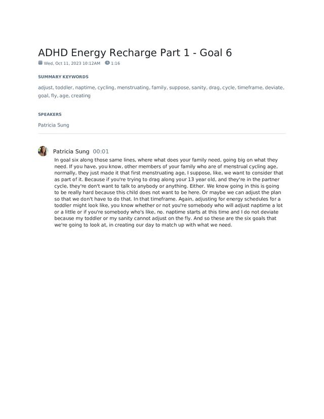 11, 2023 10:12AM 1:16 SUMMARY KEYWORDS adjust, toddler, naptime, cycling, menstruating, family, suppose, sanity, drag, cycle, timeframe, deviate, goal, fly, age, creating SPEAKERS Patricia Sung Patricia Sung 00:01 In goal six along those same lines, where what does your family need, going big on what they need. If you have, you know, other members of your family who are of menstrual cycling age, normally, they just made it that first menstruating age, I suppose, like, we want to consider that as part of it. Because if you're trying to drag along your 13 year old, and they're in the partner cycle, they're don't want to talk to anybody or anything. Either. We know going in this is going to be really hard because this child does not want to be here. Or maybe we can adjust the plan so that we don't have to do that. In that timeframe. Again, adjusting for energy schedules for a toddler might look like, you know whether or not you're somebody who will adjust naptime a lot or a little or if you're somebody who's like, no. naptime starts at this time and I do not deviate because my toddler or my sanity cannot adjust on the fly. And so these are the six goals that we're going to look at, in creating our day to match up with what we need.