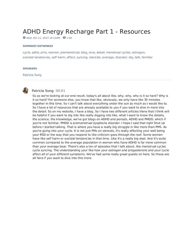 2023 10:12AM 1:58 SUMMARY KEYWORDS cycle, adhd, pms, women, premenstrual, blog, dive, detail, menstrual cycles, estrogen, suicidal tendencies, self harm, affect, syncing, steroids, average, disorder, dig, talk, familiar SPEAKERS Patricia Sung Patricia Sung 00:01 So as we're looking at our end result, today's all about like, why, why, why is it so hard? Why is it so hard? For someone else, you know that like, obviously, we only have like 30 minutes together in this time. So I can't talk about everything under the sun as much as I would like to. So I have a lot of resources that are already available to you if you want to dive in more into the detail. So on my website, I have a blog. So I have two different articles there that I think will be helpful if you want to dig into like really digging into like, what I want to know the details, the science, the knowledge, we've got blogs on ADHD and periods, ADHD and PMDD, which if you're not familiar, PMDD is premenstrual dysphoria disorder. I hope I said that right Shut up before I started talking. That is where you have a really big struggle in like more than PMS. As you're going into your cycle. It is not just PMs on steroids, it's really affecting your well being your RSD or the way that you respond to like criticism goes through the roof. Some women have like self harm or suicidal tendencies in that time. Like it's a really big deal. And it's quite common compared to the average population in women who have ADHD is far more common than your average bear. There's also a ton of episodes that I talk about, like menstrual cycles cycle syncing. The understanding your like how your estrogen and progesterone and your cycle affect all of your different symptoms. We've had some really great guests on here. So those are all here if you want to dive into this more