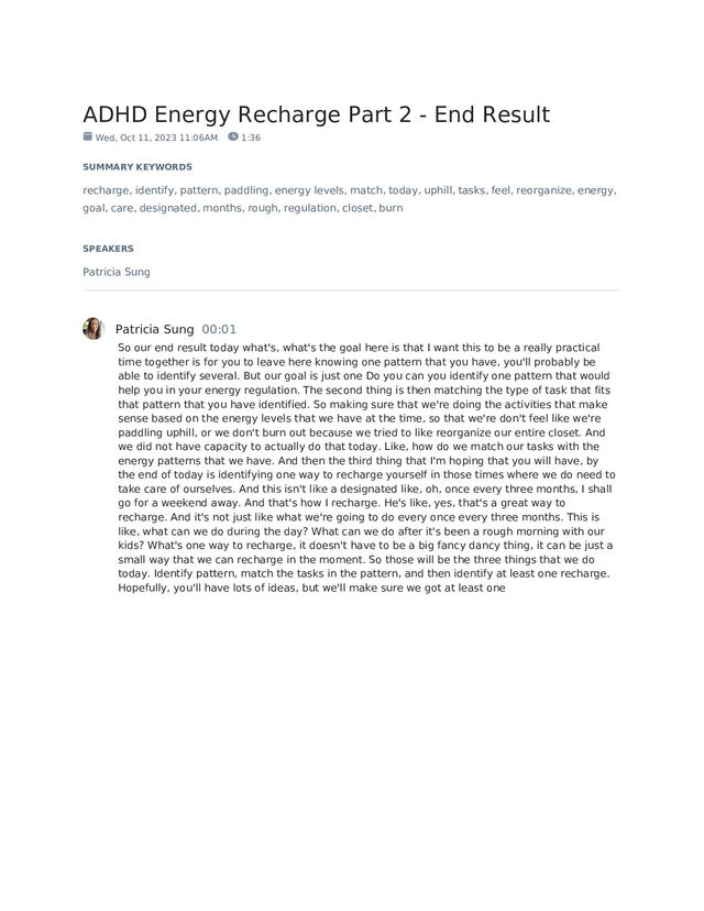 11, 2023 11:06AM 1:36 SUMMARY KEYWORDS recharge, identify, pattern, paddling, energy levels, match, today, uphill, tasks, feel, reorganize, energy, goal, care, designated, months, rough, regulation, closet, burn SPEAKERS Patricia Sung Patricia Sung 00:01 So our end result today what's, what's the goal here is that I want this to be a really practical time together is for you to leave here knowing one pattern that you have, you'll probably be able to identify several. But our goal is just one Do you can you identify one pattern that would help you in your energy regulation. The second thing is then matching the type of task that fits that pattern that you have identified. So making sure that we're doing the activities that make sense based on the energy levels that we have at the time, so that we're don't feel like we're paddling uphill, or we don't burn out because we tried to like reorganize our entire closet. And we did not have capacity to actually do that today. Like, how do we match our tasks with the energy patterns that we have. And then the third thing that I'm hoping that you will have, by the end of today is identifying one way to recharge yourself in those times where we do need to take care of ourselves. And this isn't like a designated like, oh, once every three months, I shall go for a weekend away. And that's how I recharge. He's like, yes, that's a great way to recharge. And it's not just like what we're going to do every once every three months. This is like, what can we do during the day? What can we do after it's been a rough morning with our kids? What's one way to recharge, it doesn't have to be a big fancy dancy thing, it can be just a small way that we can recharge in the moment. So those will be the three things that we do today. Identify pattern, match the tasks in the pattern, and then identify at least one recharge. Hopefully, you'll have lots of ideas, but we'll make sure we got at least one