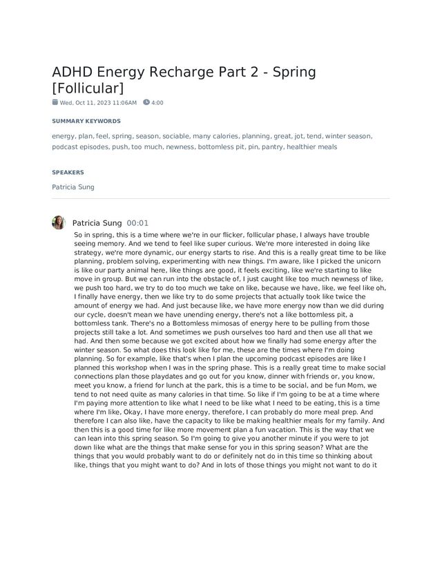 11, 2023 11:06AM 4:00 SUMMARY KEYWORDS energy, plan, feel, spring, season, sociable, many calories, planning, great, jot, tend, winter season, podcast episodes, push, too much, newness, bottomless pit, pin, pantry, healthier meals SPEAKERS Patricia Sung Patricia Sung 00:01 So in spring, this is a time where we're in our flicker, follicular phase, I always have trouble seeing memory. And we tend to feel like super curious. We're more interested in doing like strategy, we're more dynamic, our energy starts to rise. And this is a really great time to be like planning, problem solving, experimenting with new things. I'm aware, like I picked the unicorn is like our party animal here, like things are good, it feels exciting, like we're starting to like move in group. But we can run into the obstacle of, I just caught like too much newness of like, we push too hard, we try to do too much we take on like, because we have, like, we feel like oh, I finally have energy, then we like try to do some projects that actually took like twice the amount of energy we had. And just because like, we have more energy now than we did during our cycle, doesn't mean we have unending energy, there's not a like bottomless pit, a bottomless tank. There's no a Bottomless mimosas of energy here to be pulling from those projects still take a lot. And sometimes we push ourselves too hard and then use all that we had. And then some because we got excited about how we finally had some energy after the winter season. So what does this look like for me, these are the times where I'm doing planning. So for example, like that's when I plan the upcoming podcast episodes are like I planned this workshop when I was in the spring phase. This is a really great time to make social connections plan those playdates and go out for you know, dinner with friends or, you know, meet you know, a friend for lunch at the park, this is a time to be social, and be fun Mom, we tend to not need quite as many calories in that time. So like if I'm going to be at a time where I'm paying more attention to like what I need to be like what I need to be eating, this is a time where I'm like, Okay, I have more energy, therefore, I can probably do more meal prep. And therefore I can also like, have the capacity to like be making healthier meals for my family. And then this is a good time for like more movement plan a fun vacation. This is the way that we can lean into this spring season. So I'm going to give you another minute if you were to jot down like what are the things that make sense for you in this spring season? What are the things that you would probably want to do or definitely not do in this time so thinking about like, things that you might want to do? And in lots of those things you might not want to do it