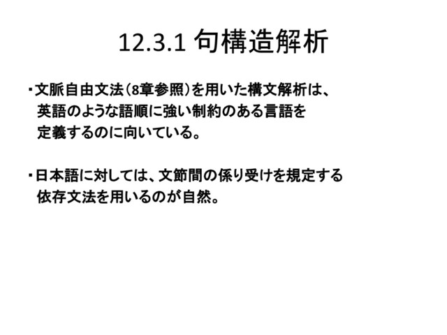 12.3.1 句構造解析 ・文脈自由文法(8章参照)を用いた構文解析は、 英語のような語順に強い制約のある言語を 定義するのに向いている。 ・日本語に対しては、文節間の係り受けを規定する 依存文法を用いるのが自然。