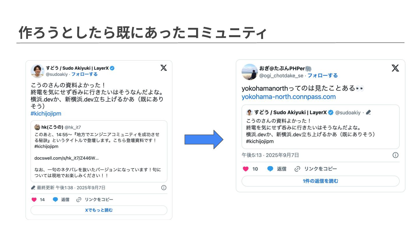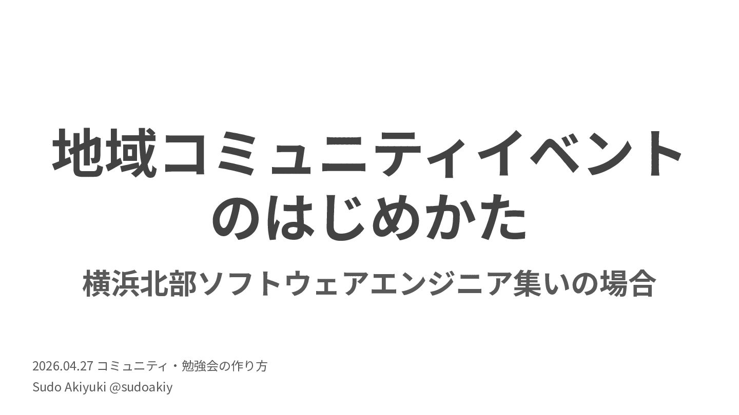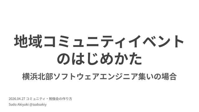 地域コミュニティイベント のはじめかた 横浜北部ソフトウェアエンジニア集いの場合 2026.04.27 コミュニティ‧勉強会の作り⽅ Sudo Akiyuki @sudoakiy