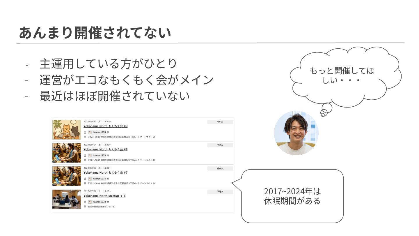 あんまり開催されてない - 主運⽤している⽅がひとり - 運営がエコなもくもく会がメイン - 最近はほぼ開催されていない 2017~2024年は 休眠期間がある もっと開催してほ
