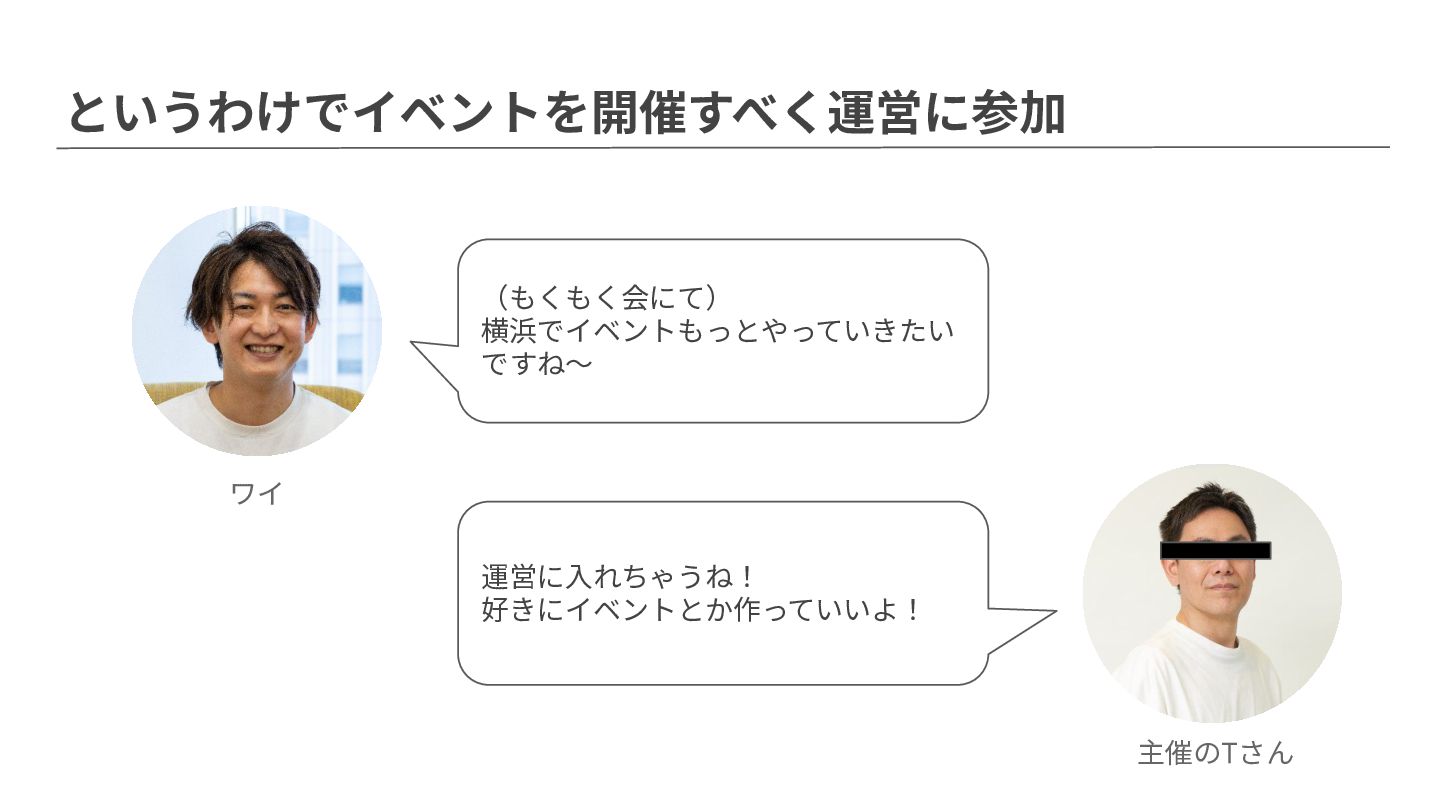 というわけでイベントを開催すべく運営に参加 (もくもく会にて) 横浜でイベントもっとやっていきたい ですね〜 運営に⼊れちゃうね! 好きにイベントとか作っていいよ! ワイ 主催のTさん