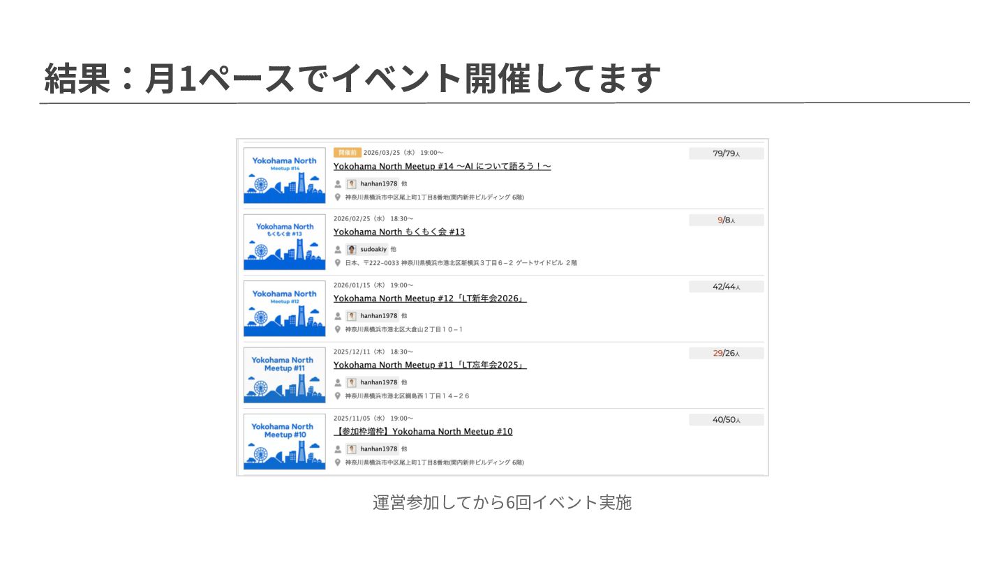 結果:⽉1ペースでイベント開催してます 運営参加してから6回イベント実施