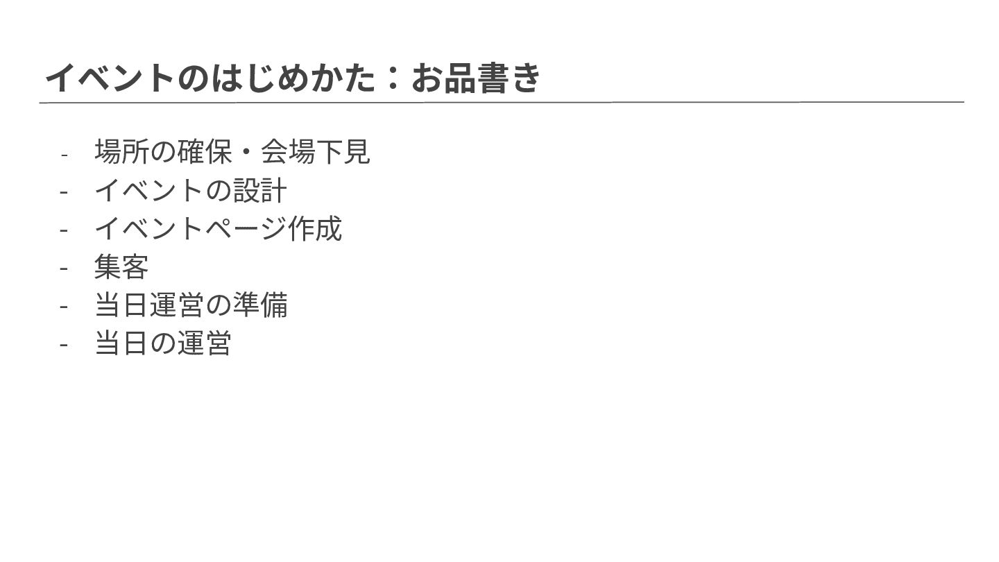 イベントのはじめかた:お品書き - 場所の確保‧会場下⾒ - イベントの設計 - イベントページ作成 - 集客 -